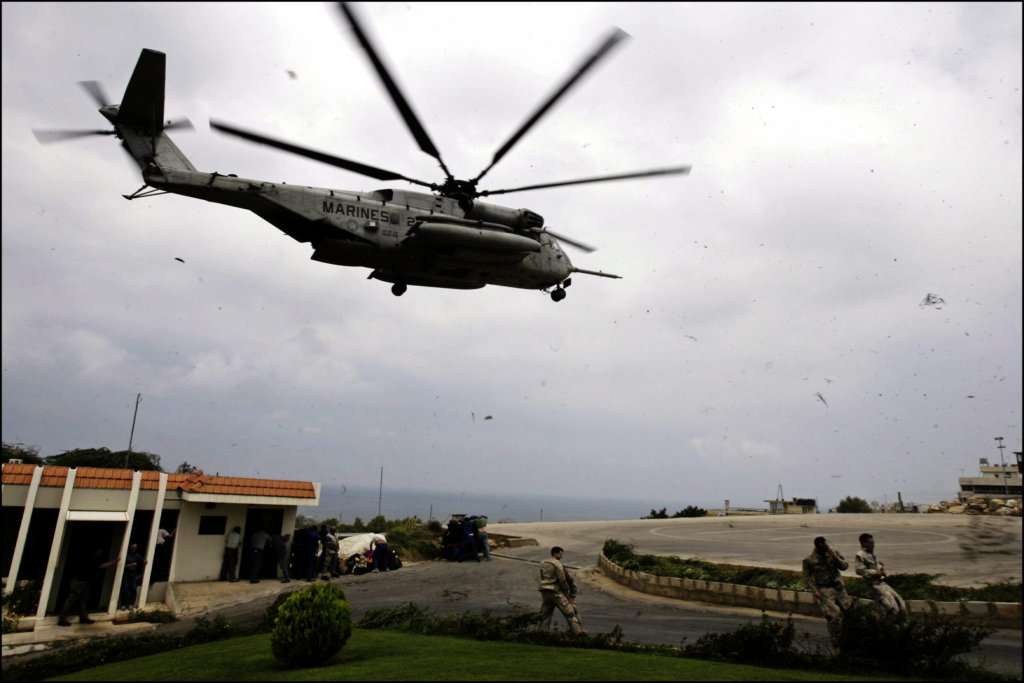 At the US embassy of Beirut, American citizens are evacuated to Cyprus by an helicopter of the US Marine corps. -