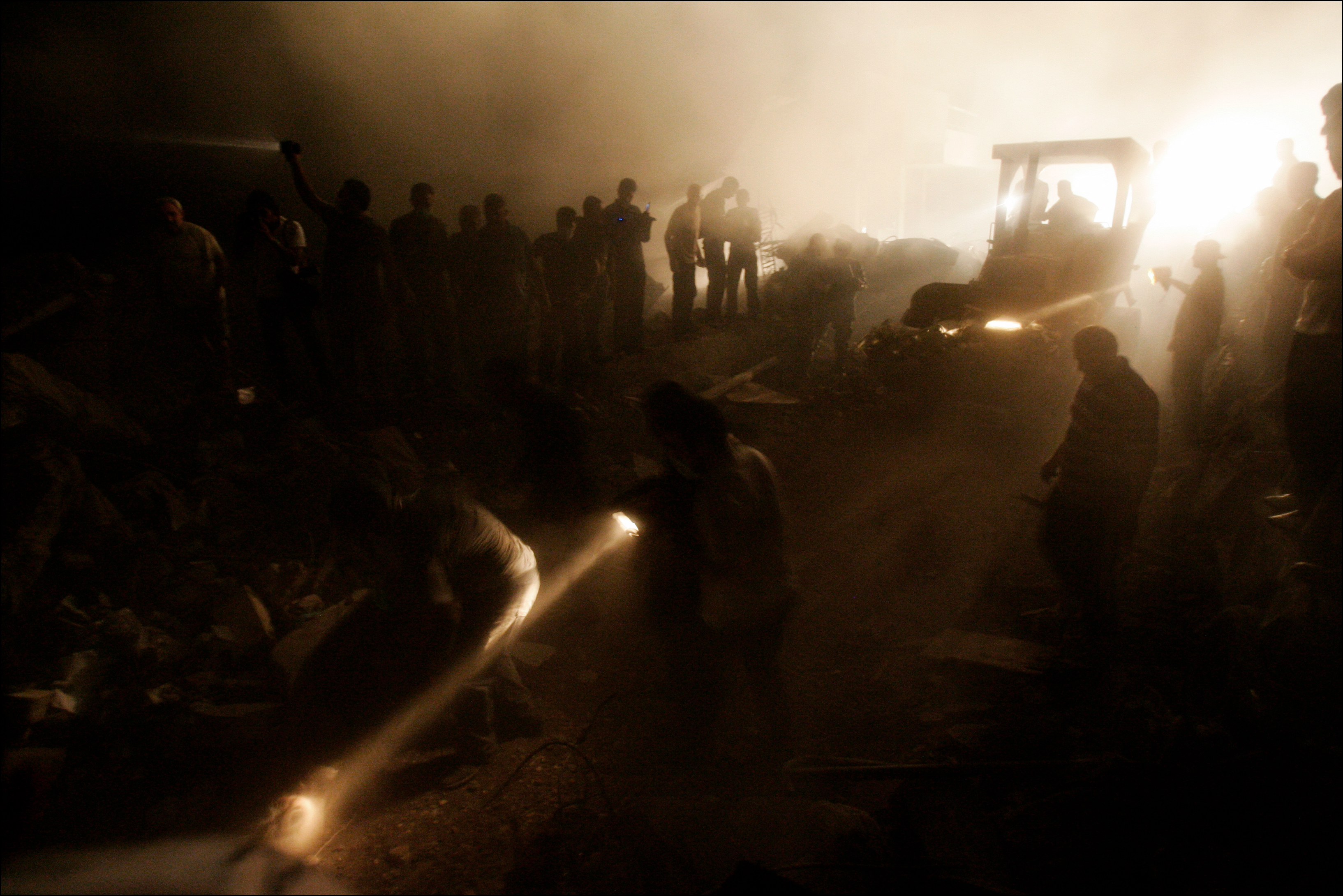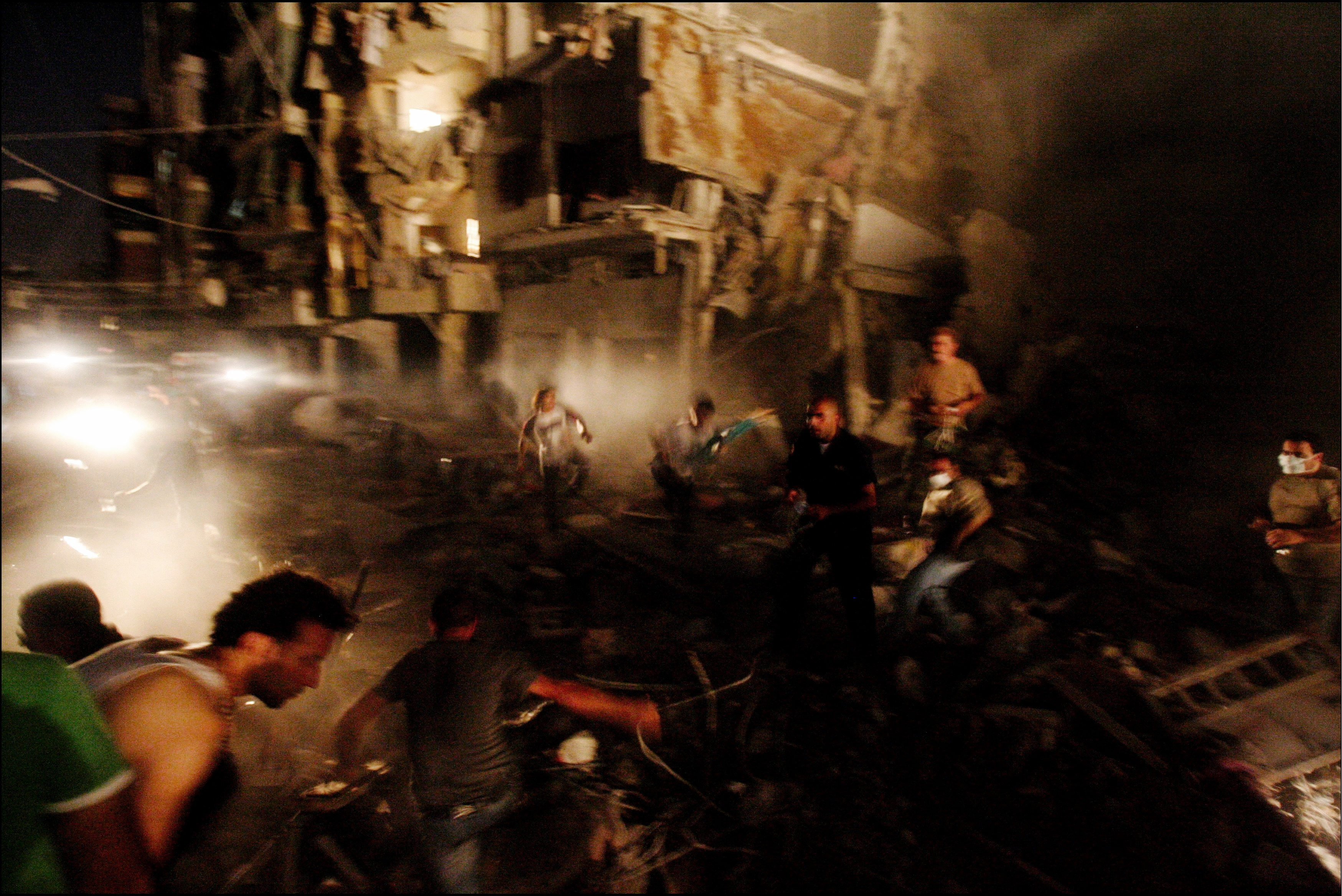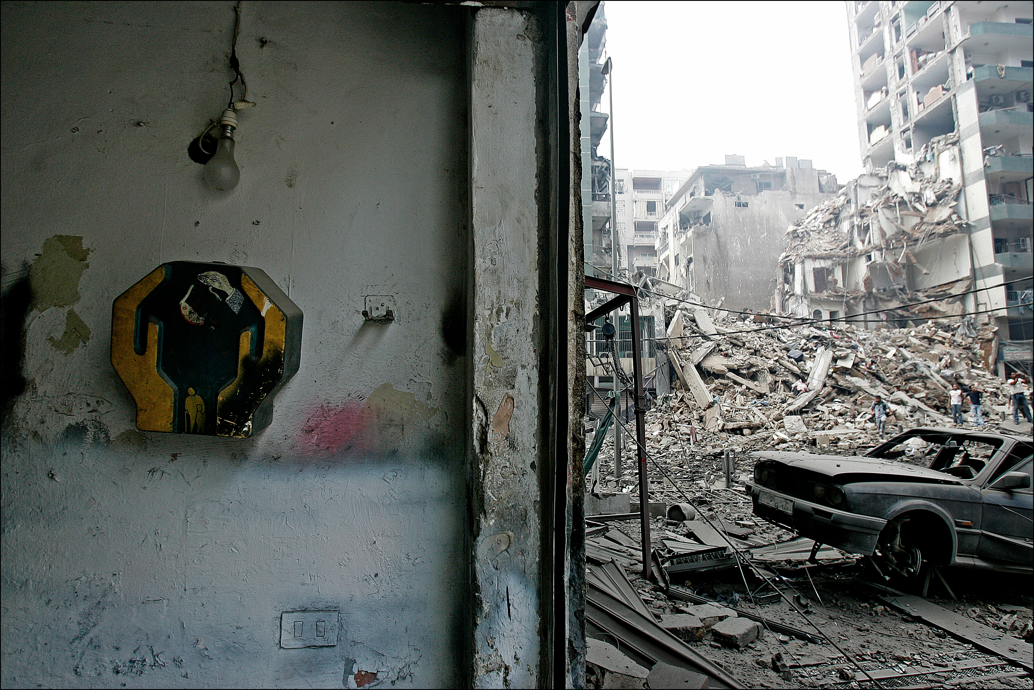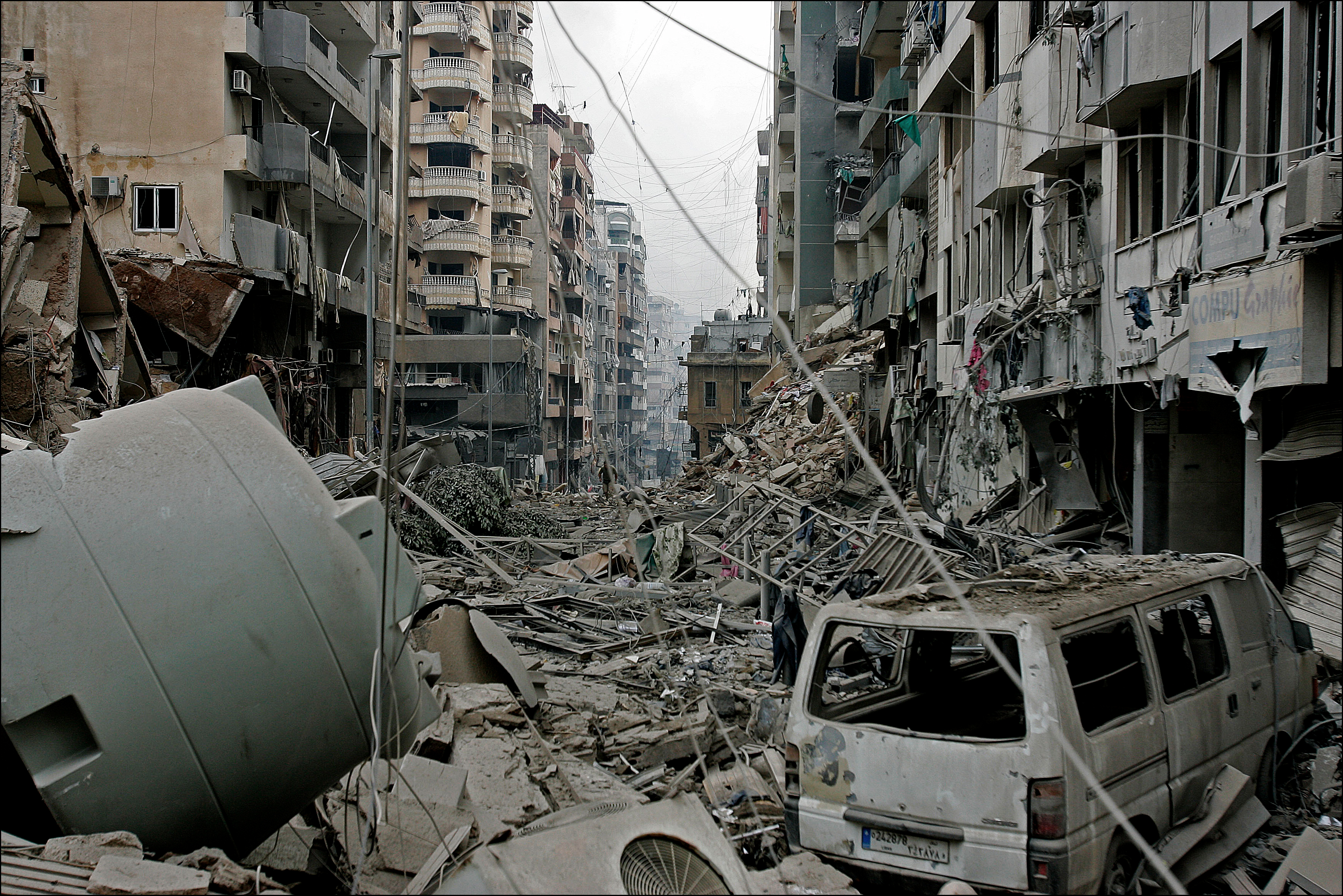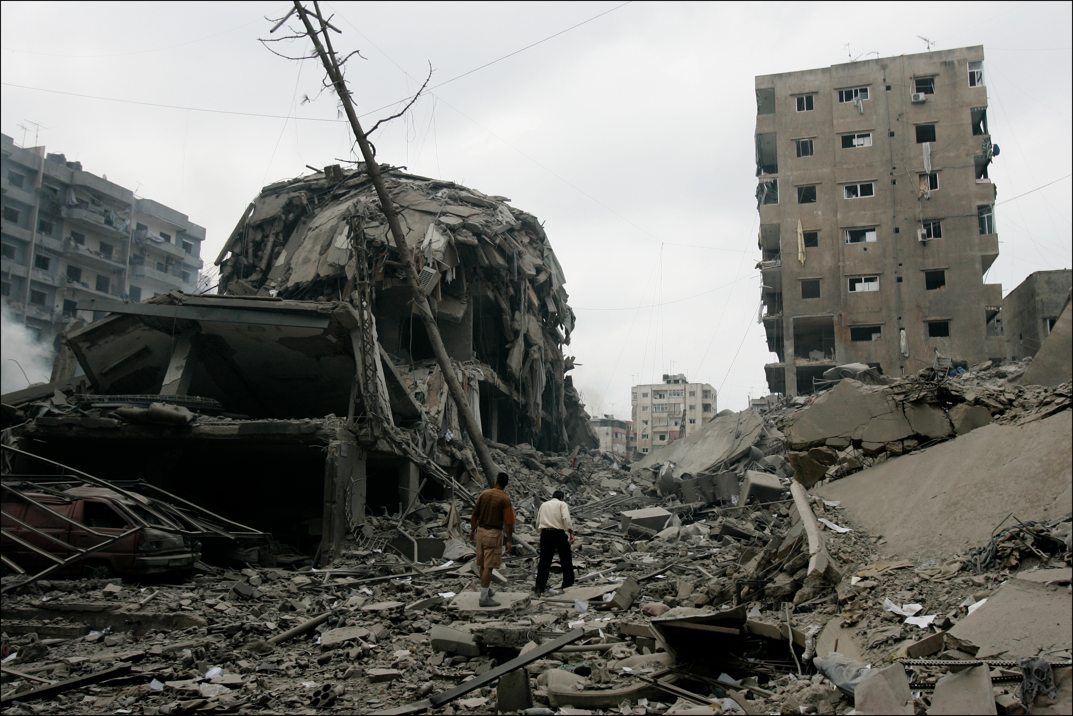 Daylight shows colossal damage after Israeli rockets rained down on Lebanon’s capital. Entire apartment buildings dissapeared after Israeli vacuum bombs hit Beirut’s Southern Shiite suburb of Dahiyeh incessantly for 3 straight days. The suburbs, where few survivors were found, were embedded in silence July 16, 2006.