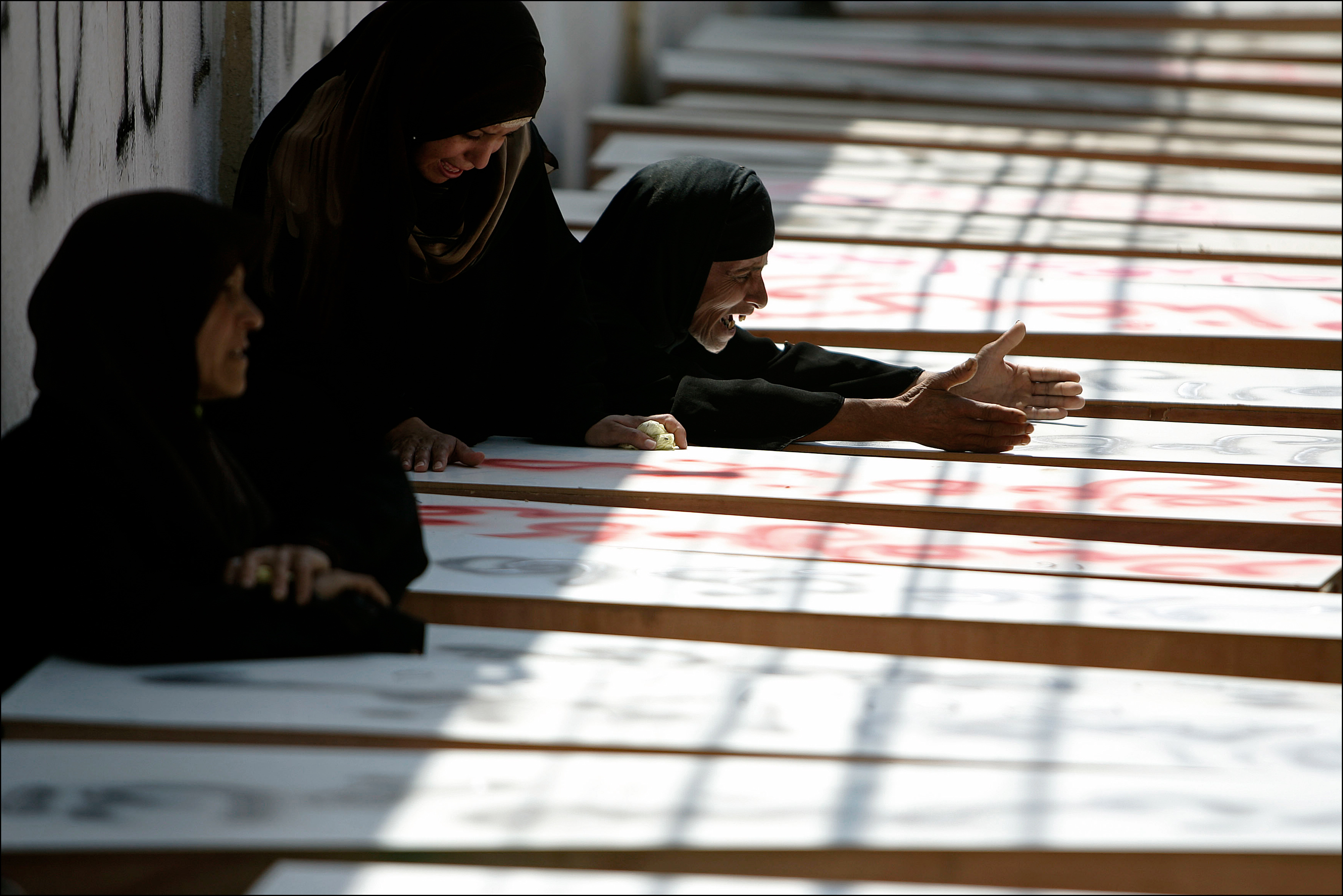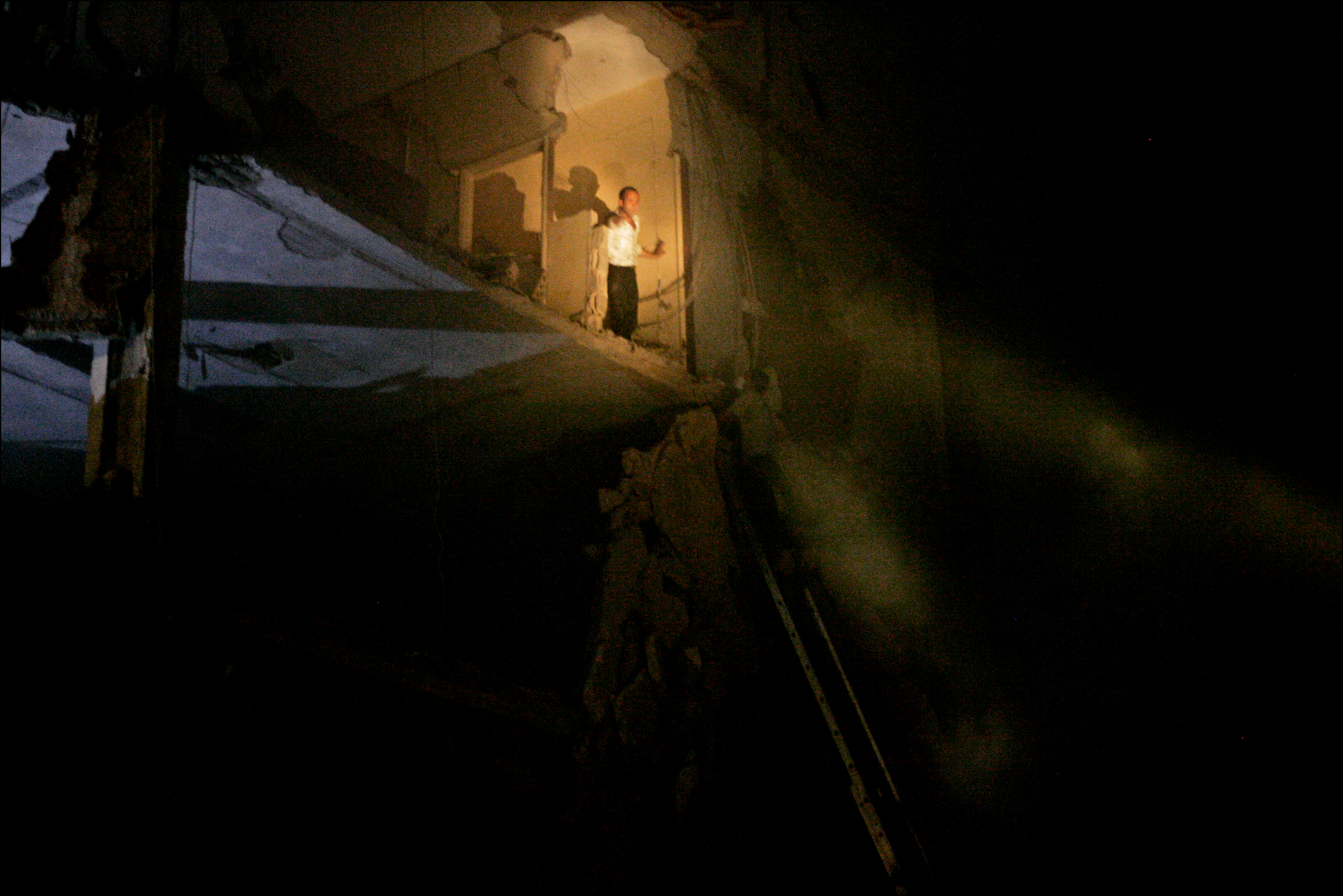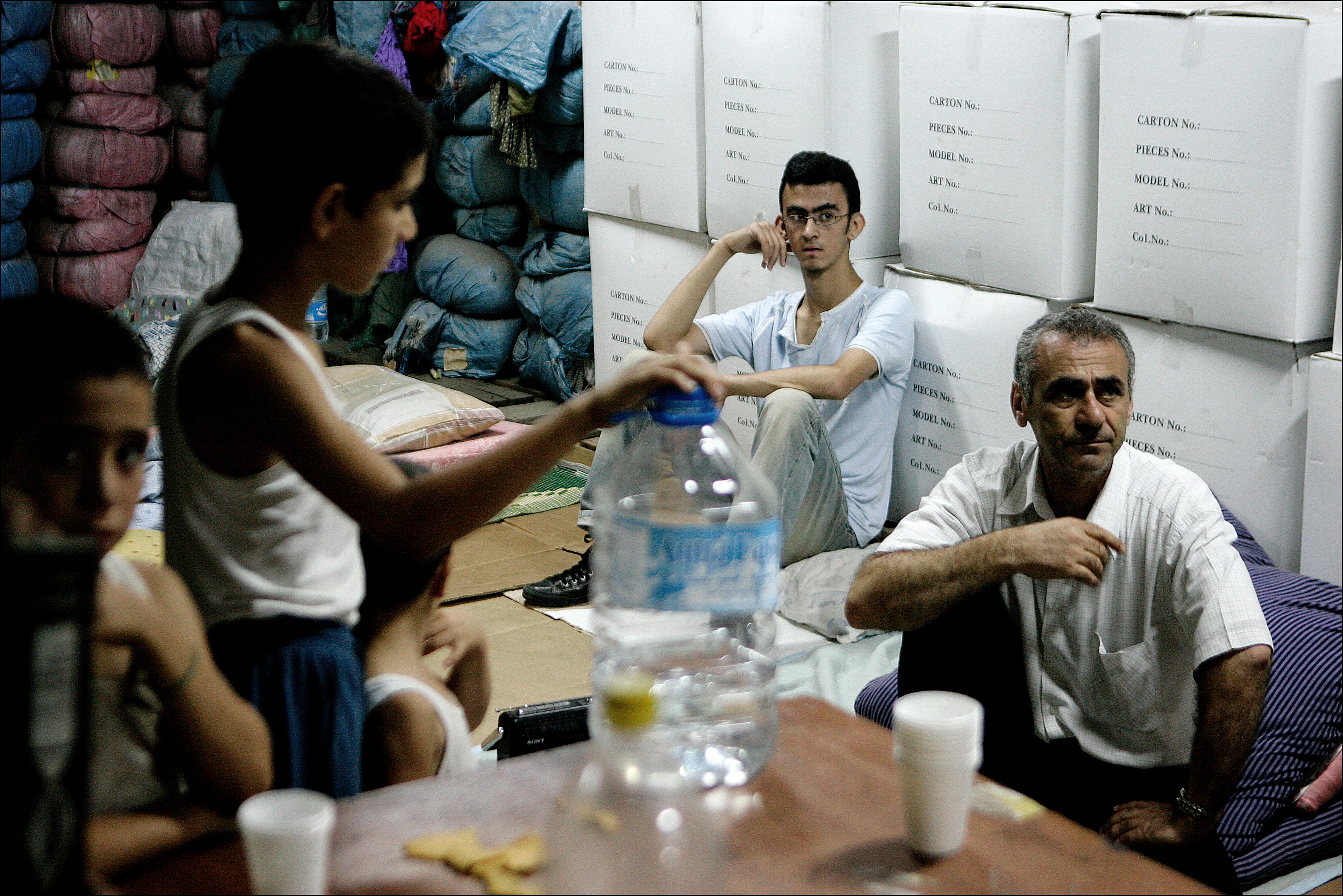 Civilian residents of Dahiyah, the southern Shiite suburb of Beirut, seek refuge in the basement of the targeted Haret Hreik area on July 16, 2006. It is unclear wether they survived the continuing bombardment during the day. Colossal damage was done to the district after Israeli rockets rained down incessantly on Lebanon’s capital. Entire apartment buildings dissapeared after Israeli vacuum bombs hit Beirut’s Southern Shiite suburb of Dahiyeh incessantly for 3 straight days.