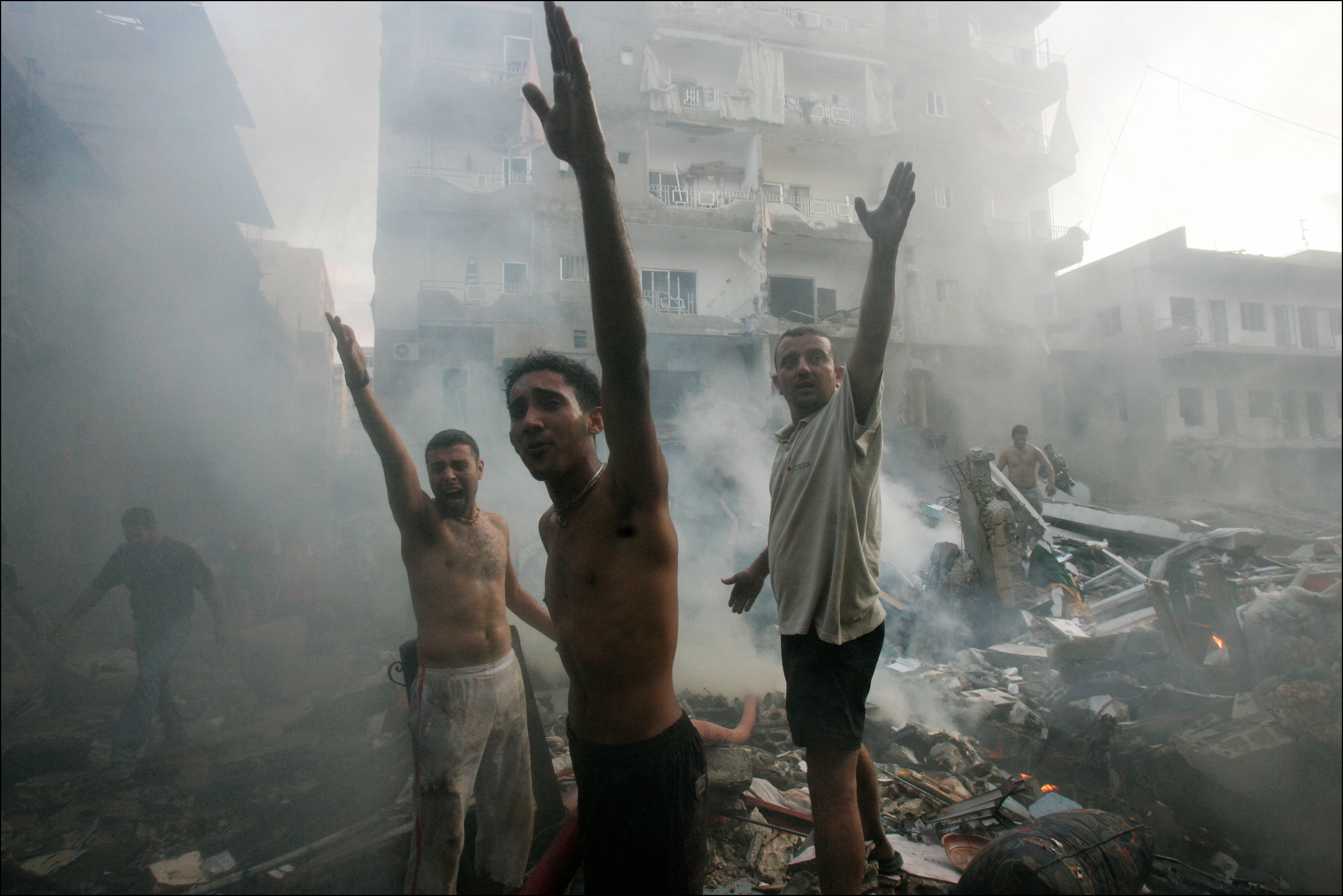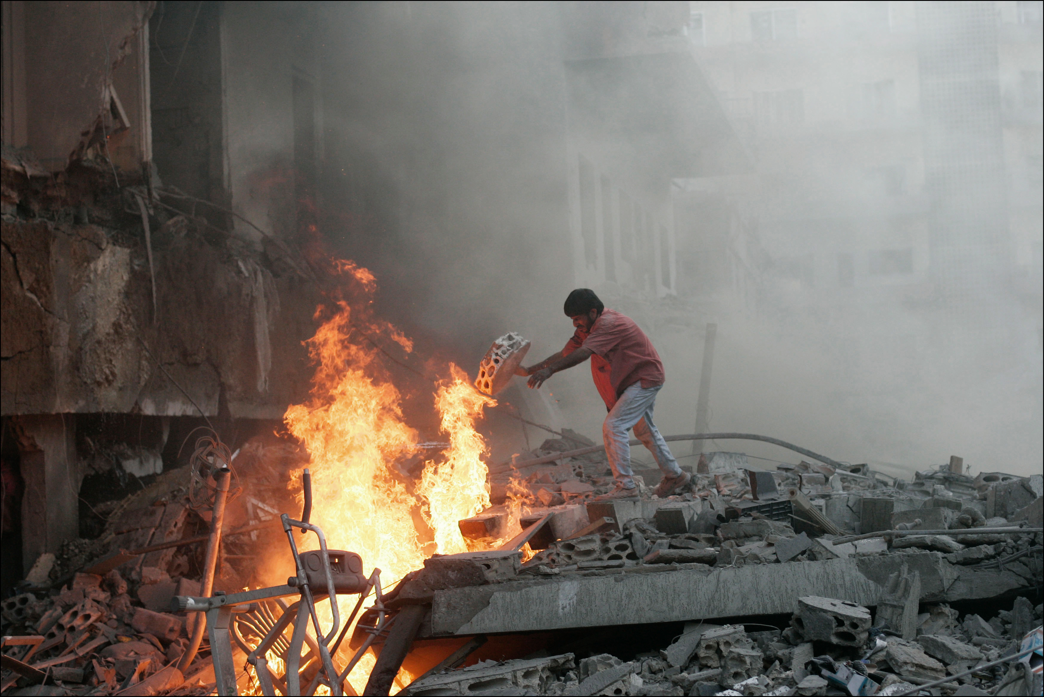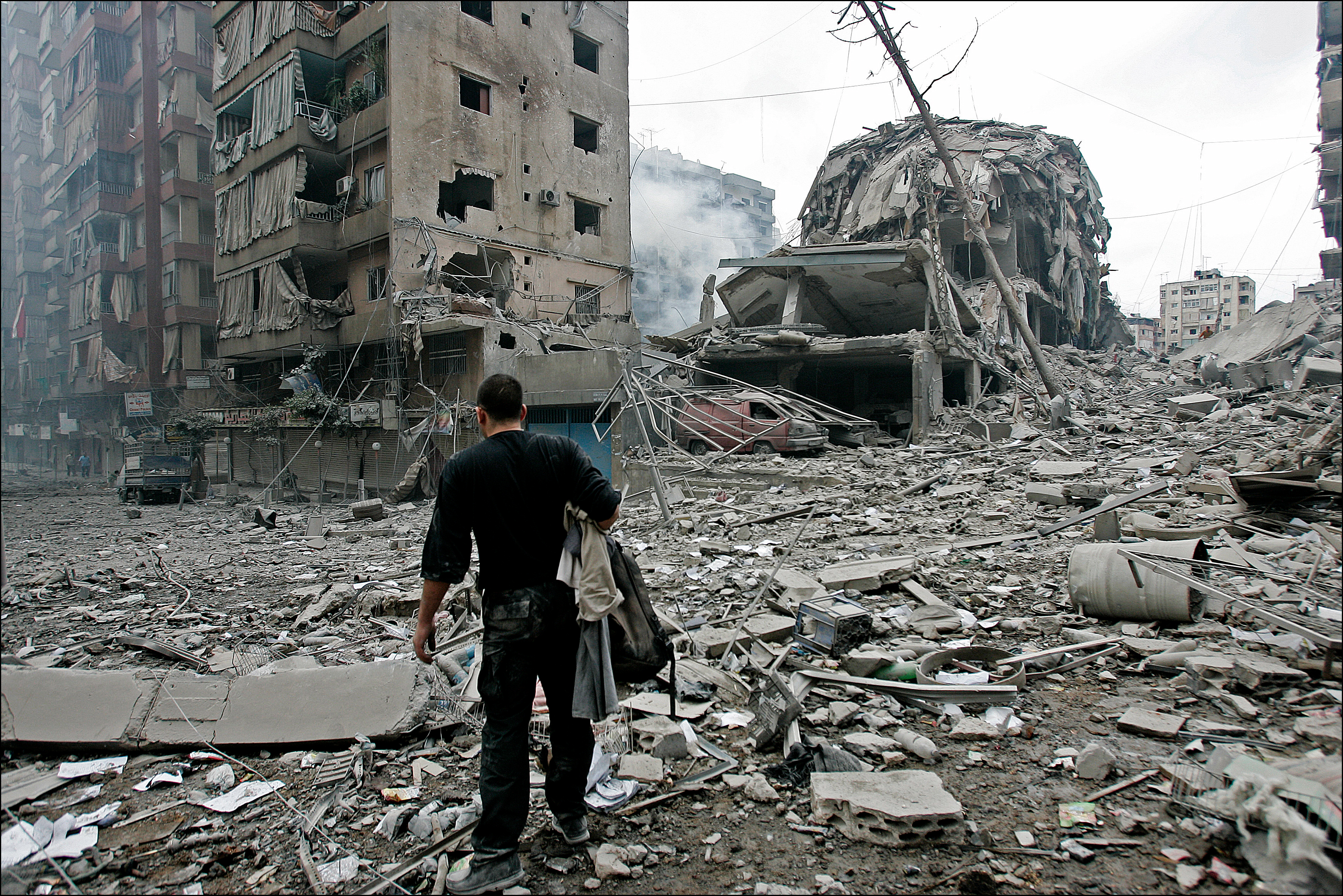 A Hizbollah militant stares in shock at the ruins now making up the Haret Hreik district of Beirut. Daylight shows colossal damage after Israeli rockets rained down on Lebanon’s capital. Entire apartment buildings dissapeared after Israeli vacuum bombs hit Beirut’s Southern Shiite suburb of Dahiyeh incessantly for 3 straight days. The suburbs, where few survivors were found, were embedded in silence July 16, 2006.