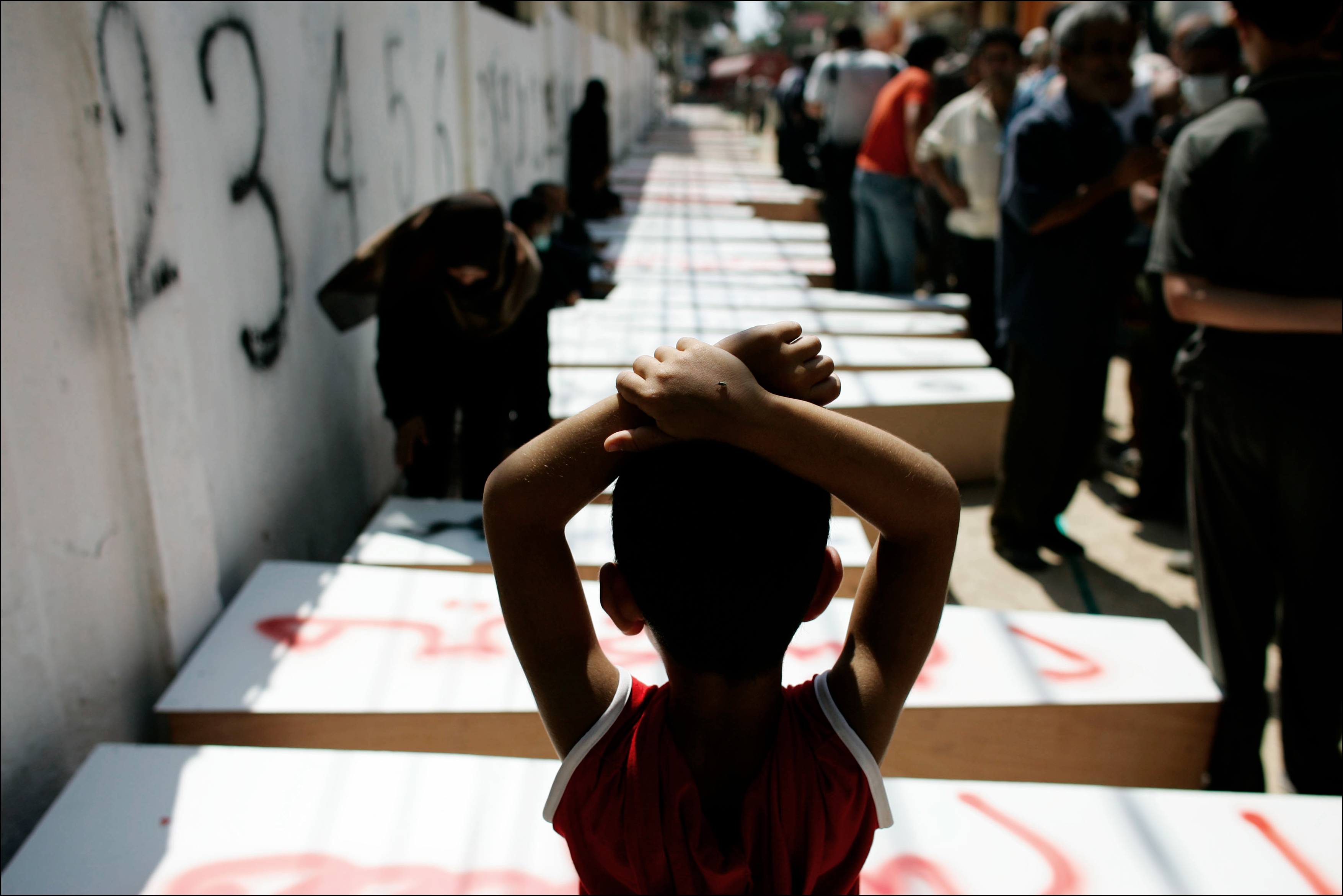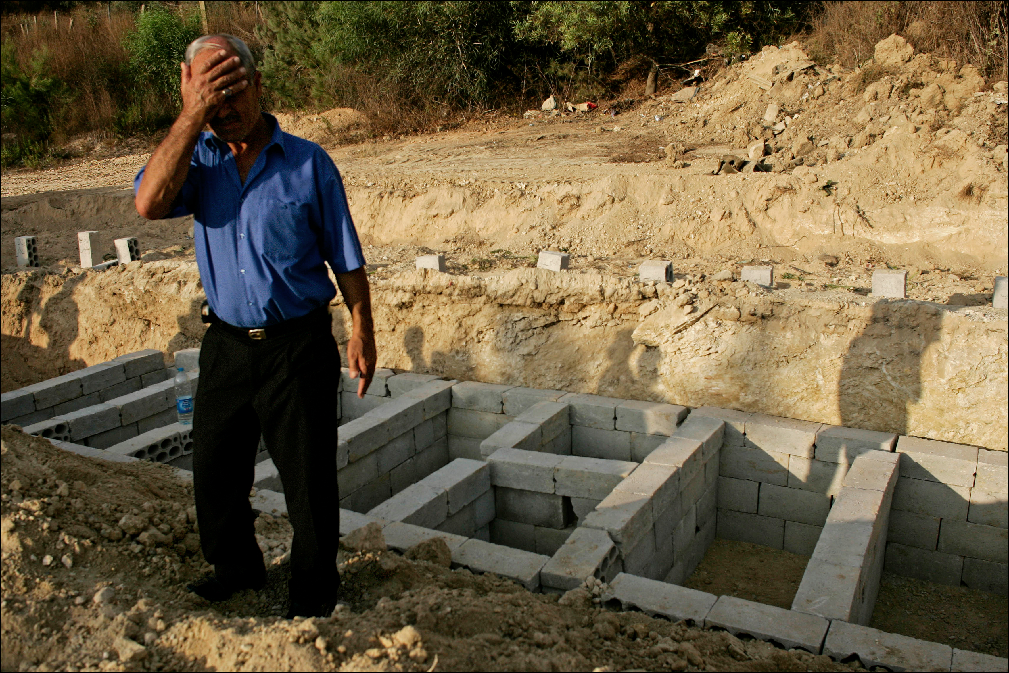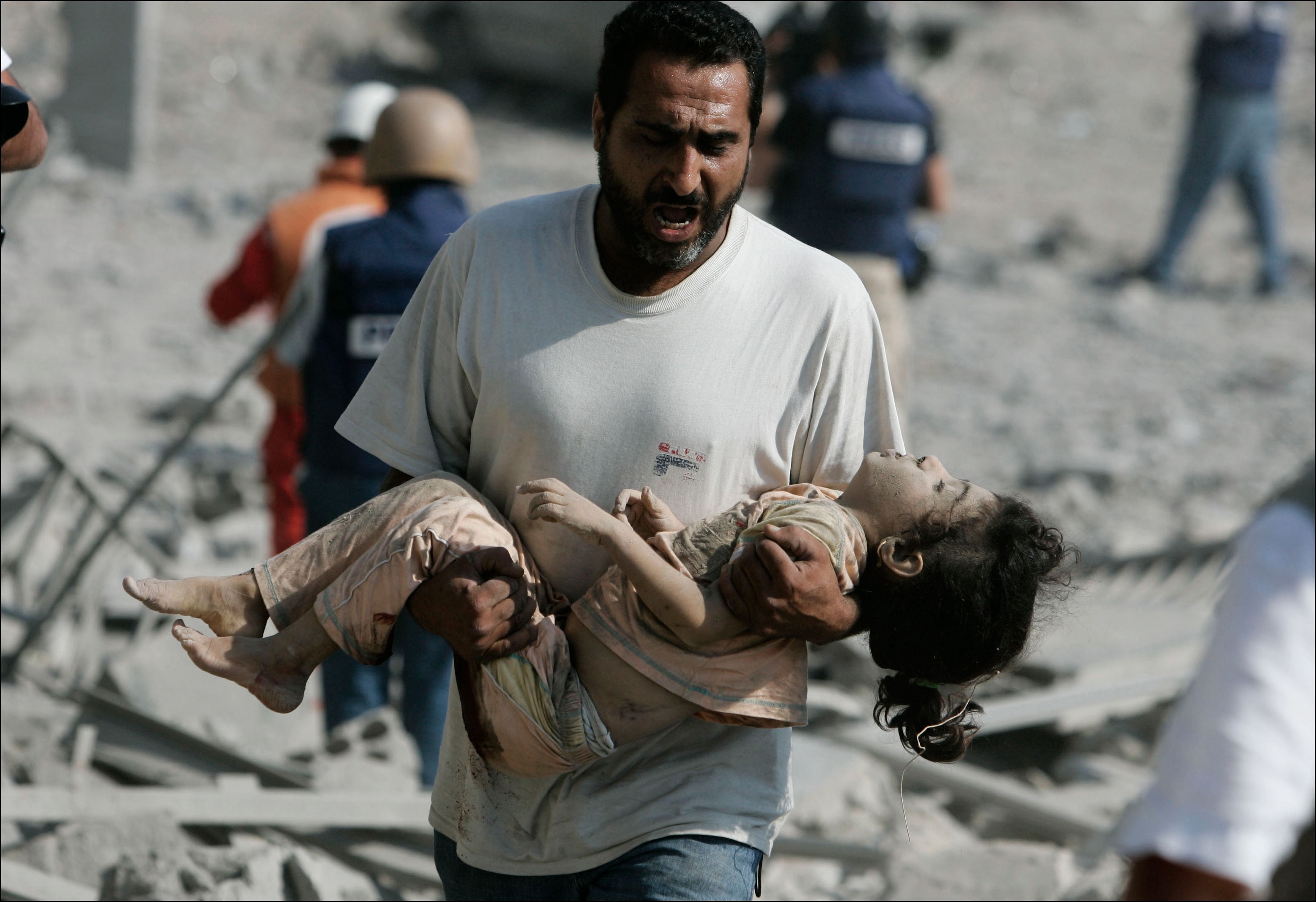 The grandfather of 2 year old Malek Jbeiri gestures after praying over the girl’s grave in Ghaziyeh, near Sidon, Lebanon. His granddaughter died when an Israeli airstrike targeted her family’s building just as a funeral procession for the 15 victims of the previous mornings bombardment passed alongside the building, creating 13 more civilian deaths.