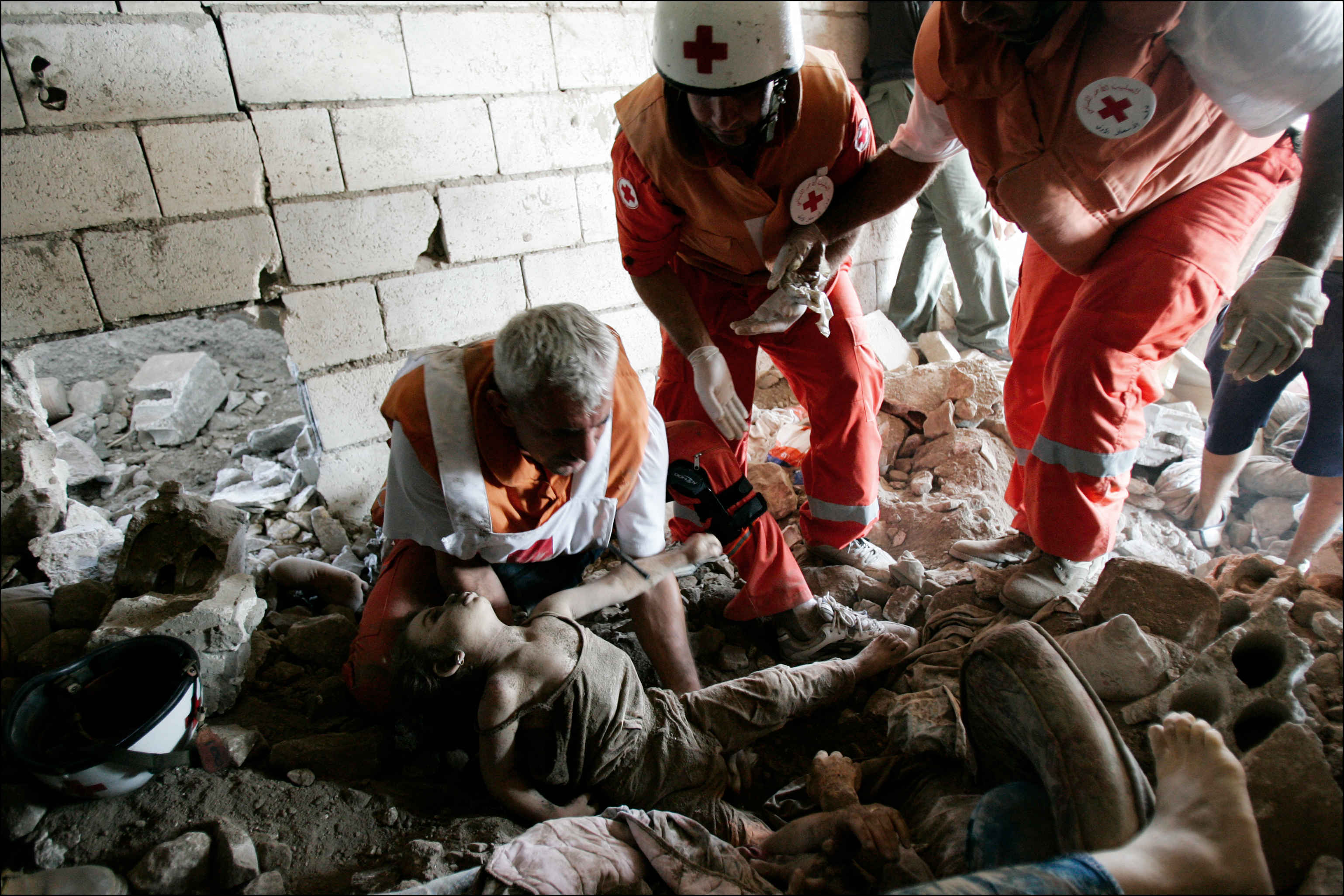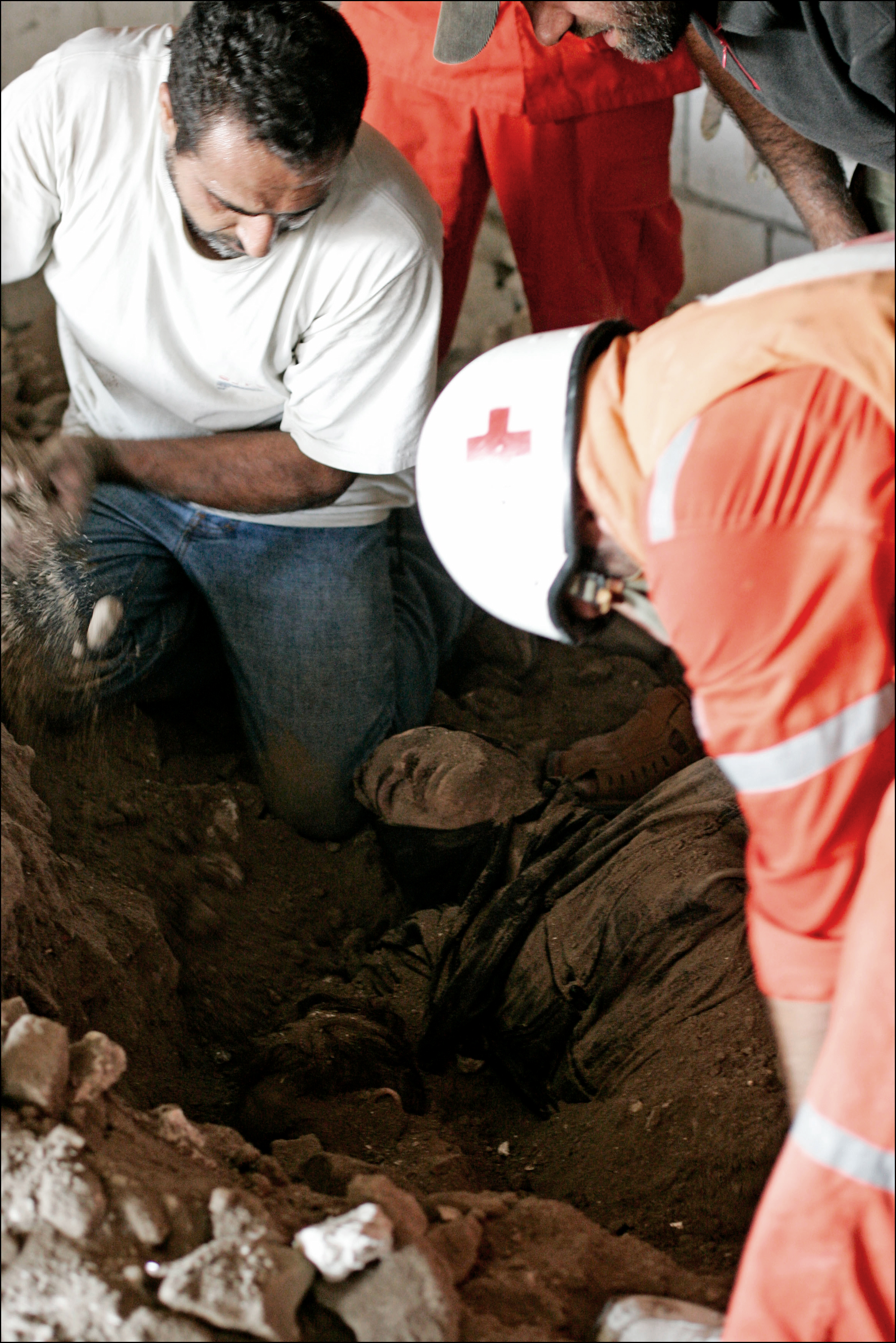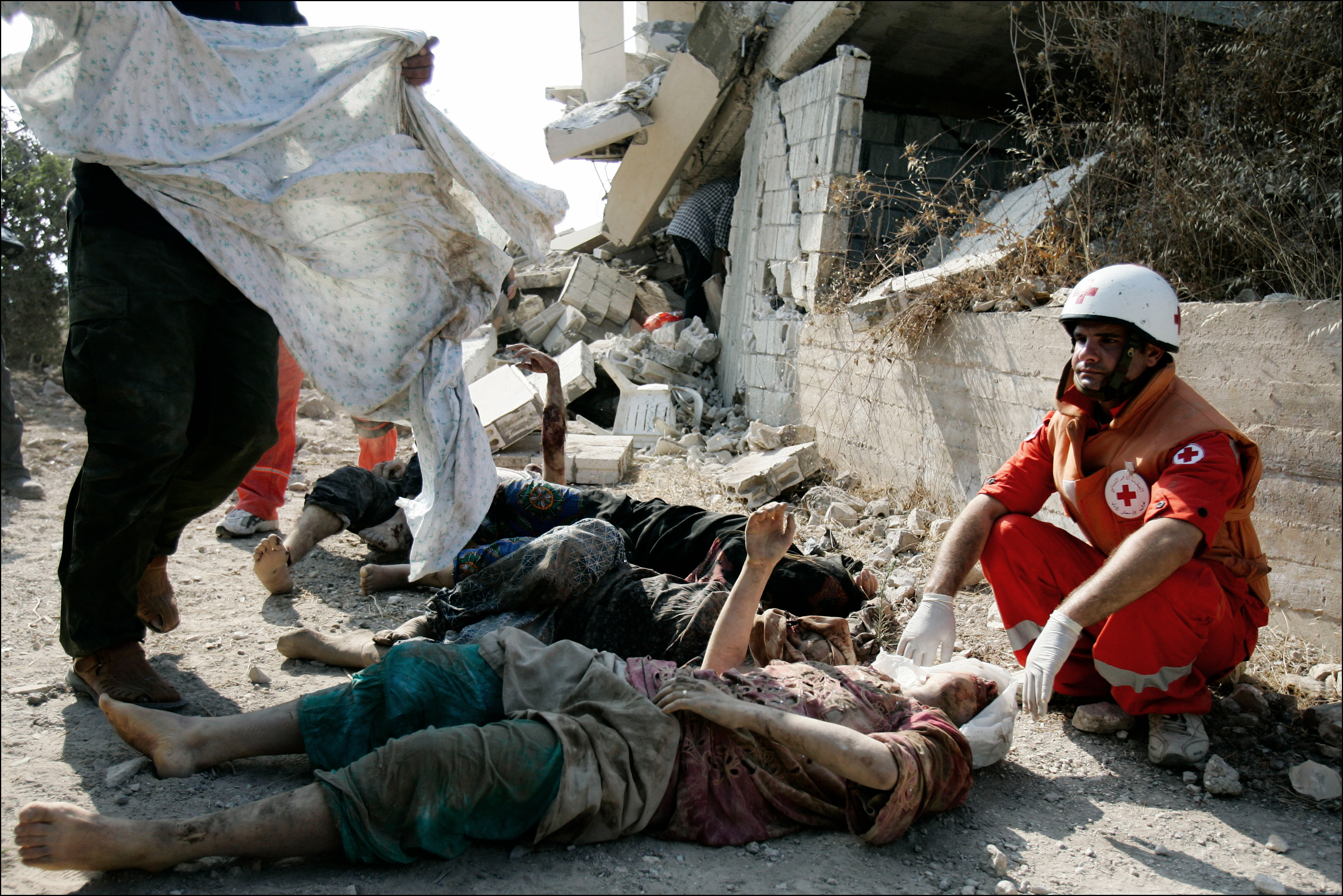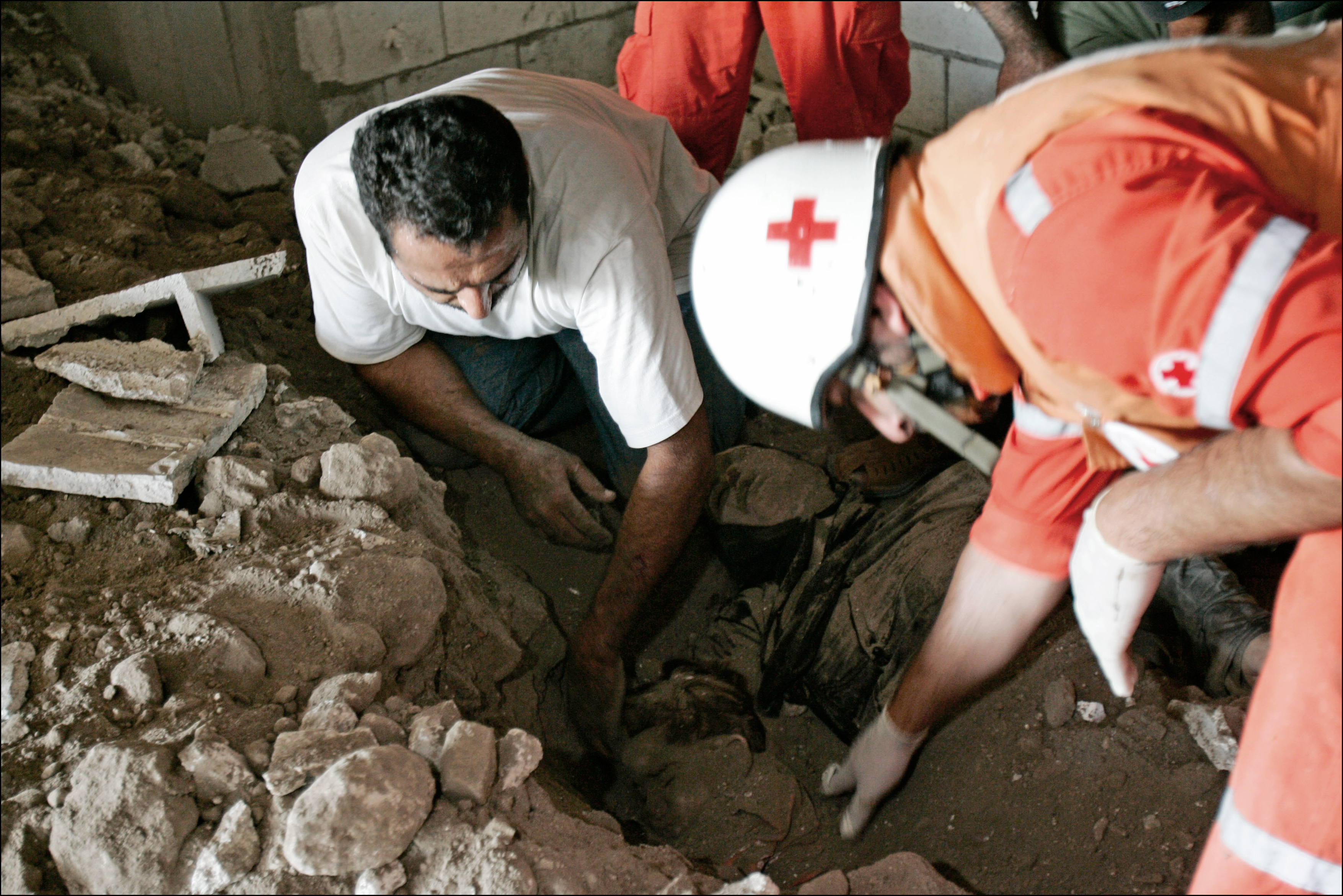 The skull of a man is found next to the bodies of his wife, mother and children, some of them still in the same position they were, seated on sofas in their living room, when an Irsaeli bomb crushed their home in the southern Lebanese town of Bint Jbeil. The family was among the first victims of the Israeli airstrikes that blitzed and flattened the city. Like many civilian victims, the incessant bombardment made it impossible for rescue workers to recover the injured and the dead from under the rubble of their houses until the ceasefire agreement one month after the beginning of the war between Israel and Lebanon. The war lead to more than1500 civilian deaths in Lebanon and vast destruction of the country’s infrastructure.