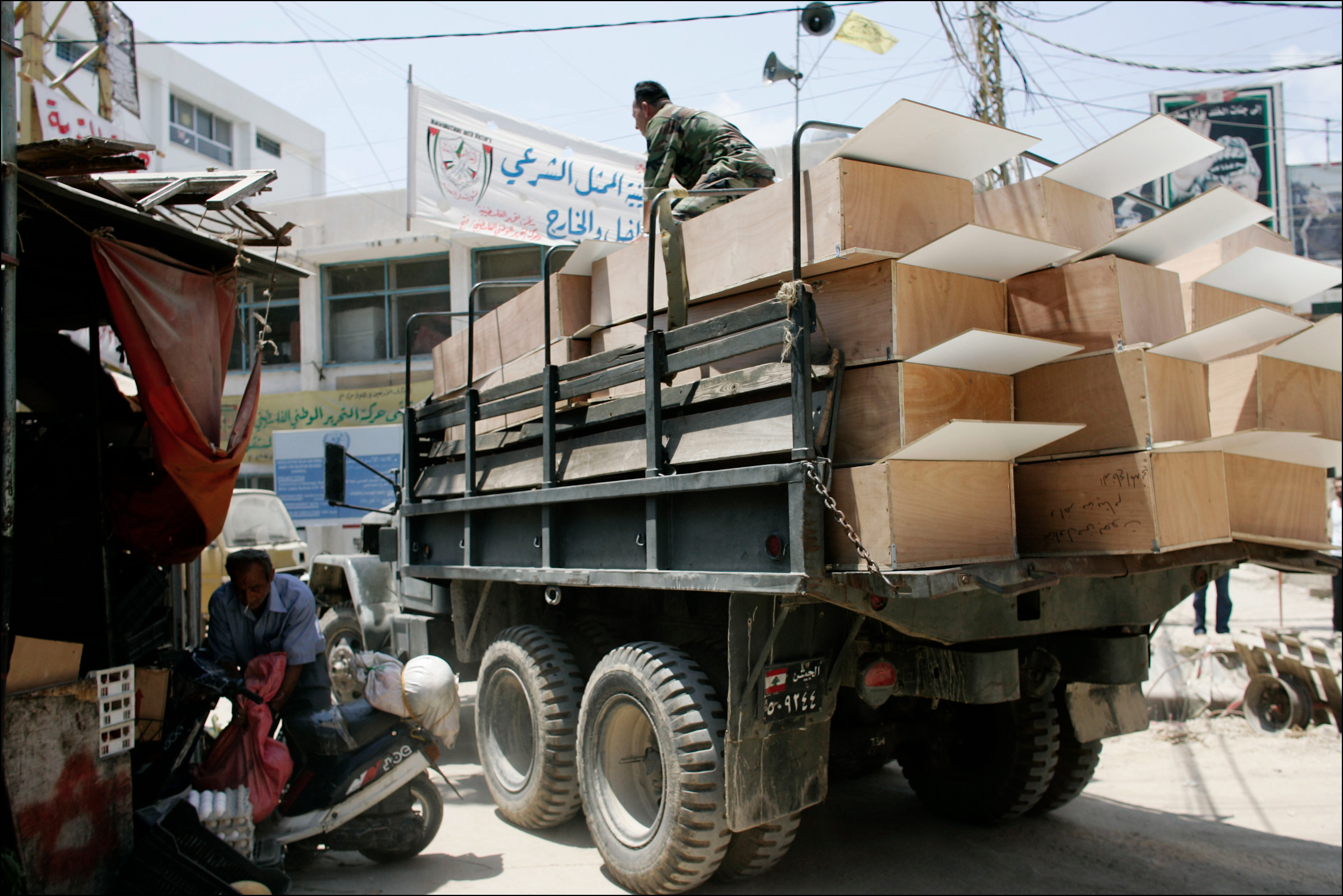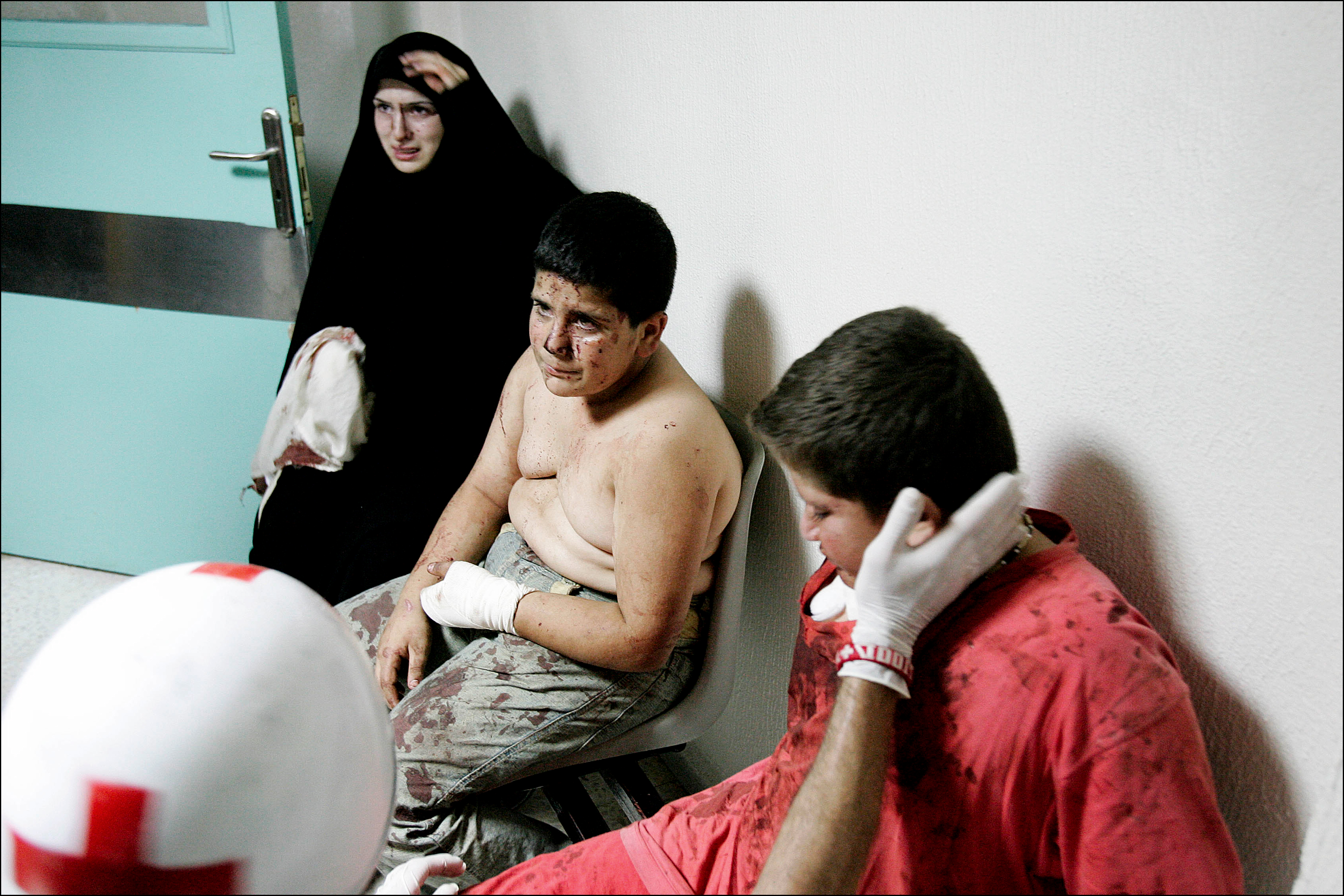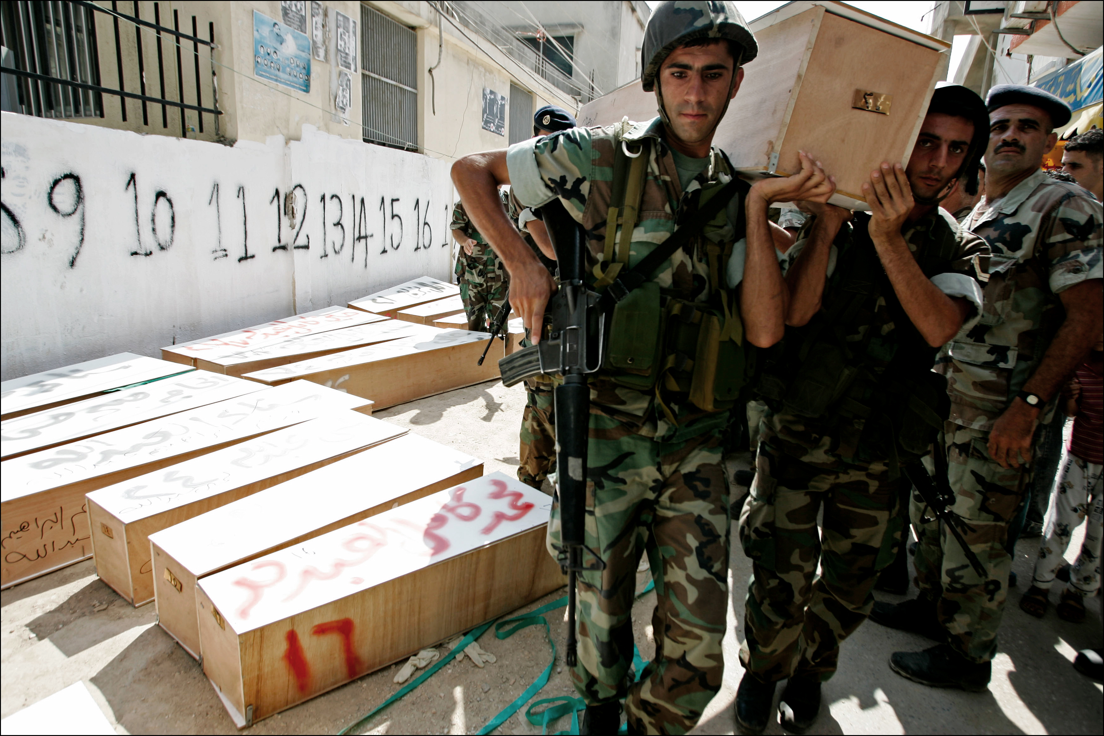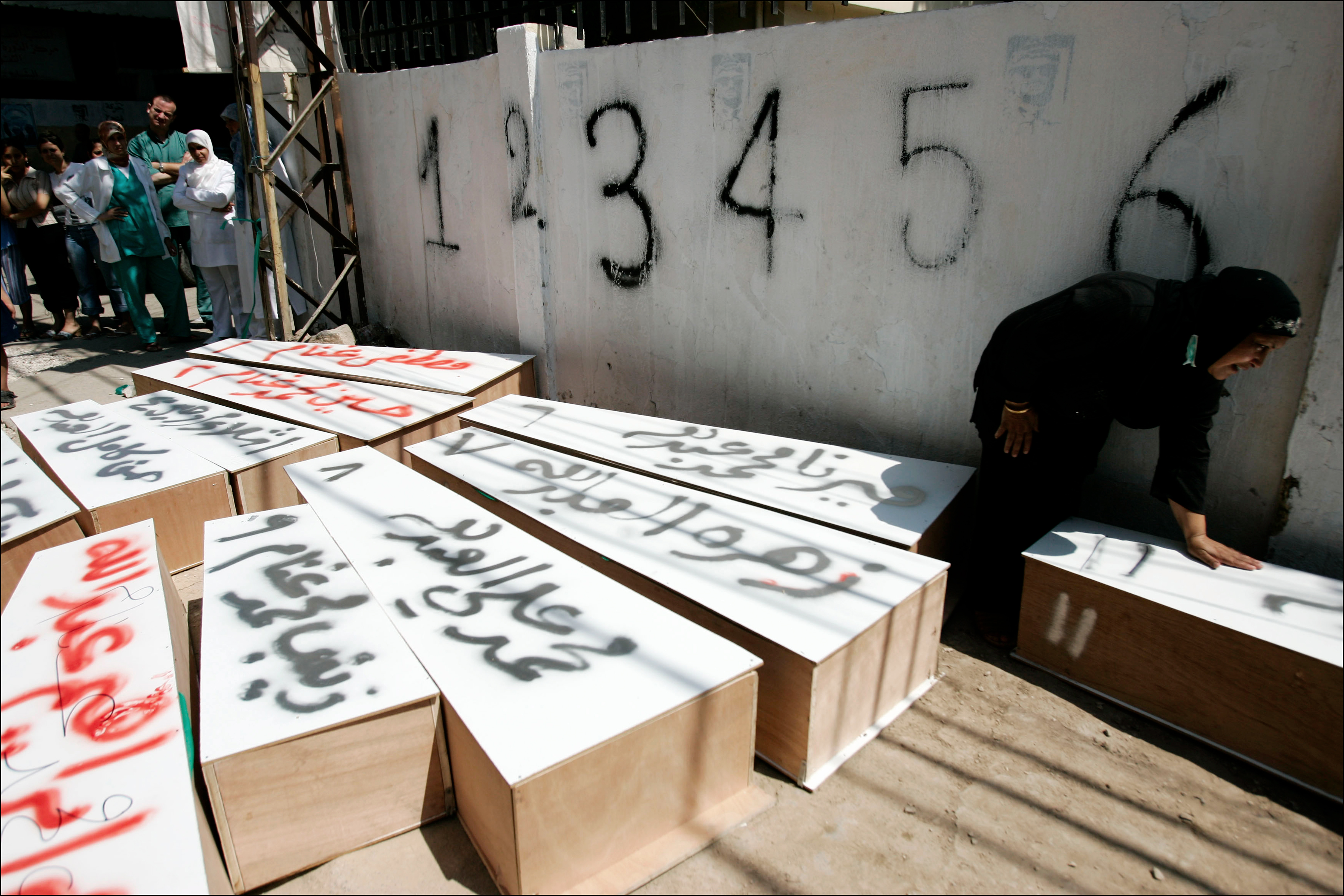 The skull of a man is found next to the bodies of his wife, mother and children, some of them still in the same position they were, seated on sofas in their living room, when an Irsaeli bomb crushed their home in the southern Lebanese town of Bint Jbeil. The family was among the first victims of the Israeli airstrikes that blitzed and flattened the city. Like many civilian victims, the incessant bombardment made it impossible for rescue workers to recover the injured and the dead from under the rubble of their houses until the ceasefire agreement one month after the beginning of the war between Israel and Lebanon. The war lead to more than1500 civilian deaths in Lebanon and vast destruction of the country’s infrastructure.