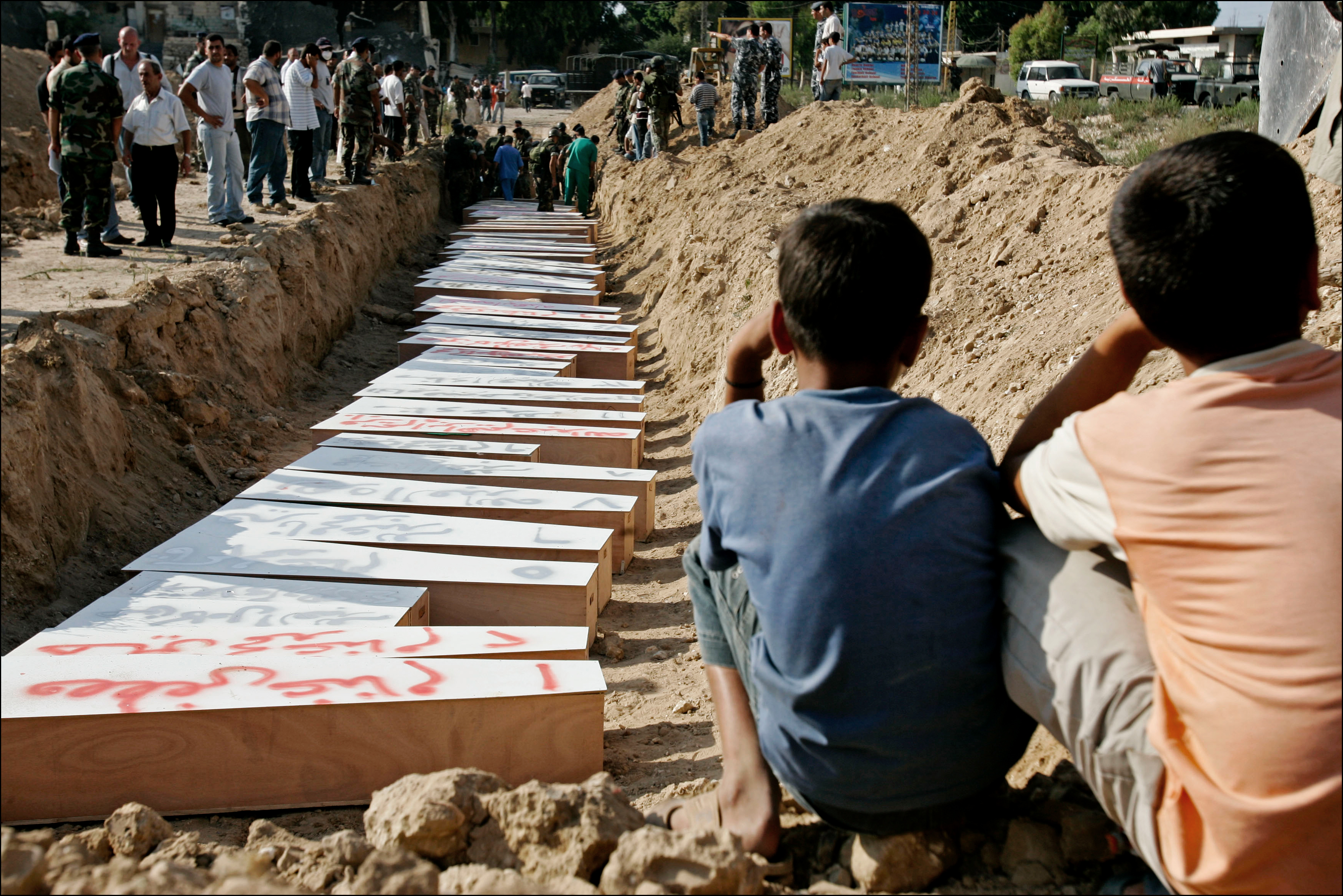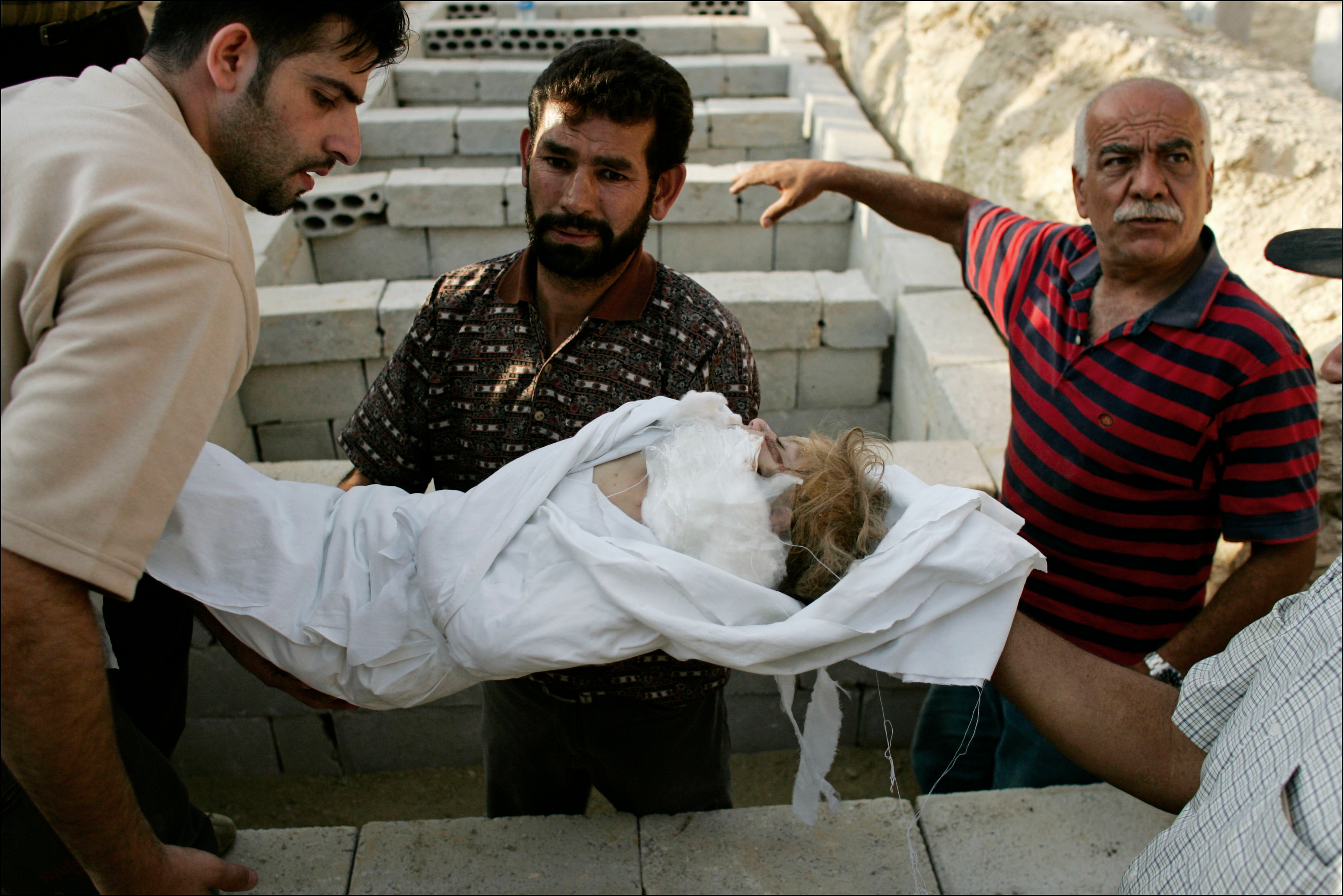 Residents of Ghaziyeh, near Sidon, Lebanon put the body of 2 year old Malek Jbeiri into a hurriedly made grave. The girl died when an Israeli airstrike targeted her family’s building just as a funeral procession for the 15 victims of the previous mornings bombardment passed alongside the building, creating 13 more civilian deaths.