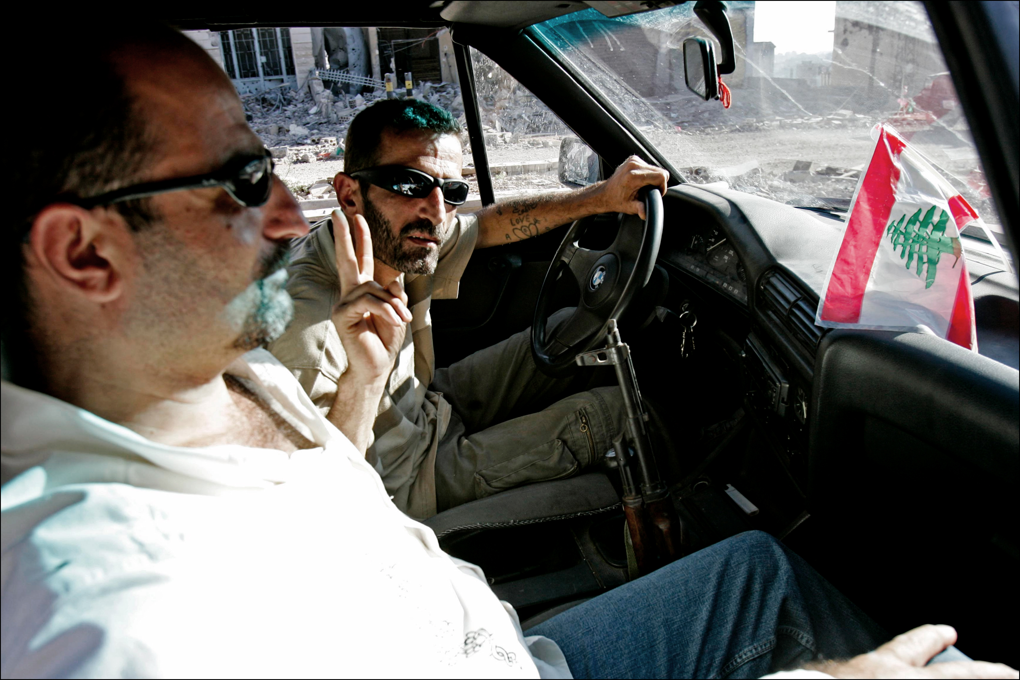 Members of the Shiite Amal party, linked to Hizbollah, drive through the destroyed southern Lebanese city of Bint Jbeil making the victory sign and showing their AK 47. Many Lebanese celebrated what they perceive as the win of Hizbollah after a month long war with Israel. The war lead to over 1000 civilian deaths in Lebanon and vast destruction of the country’s infrastructure from heavy Israeli bombardments. .