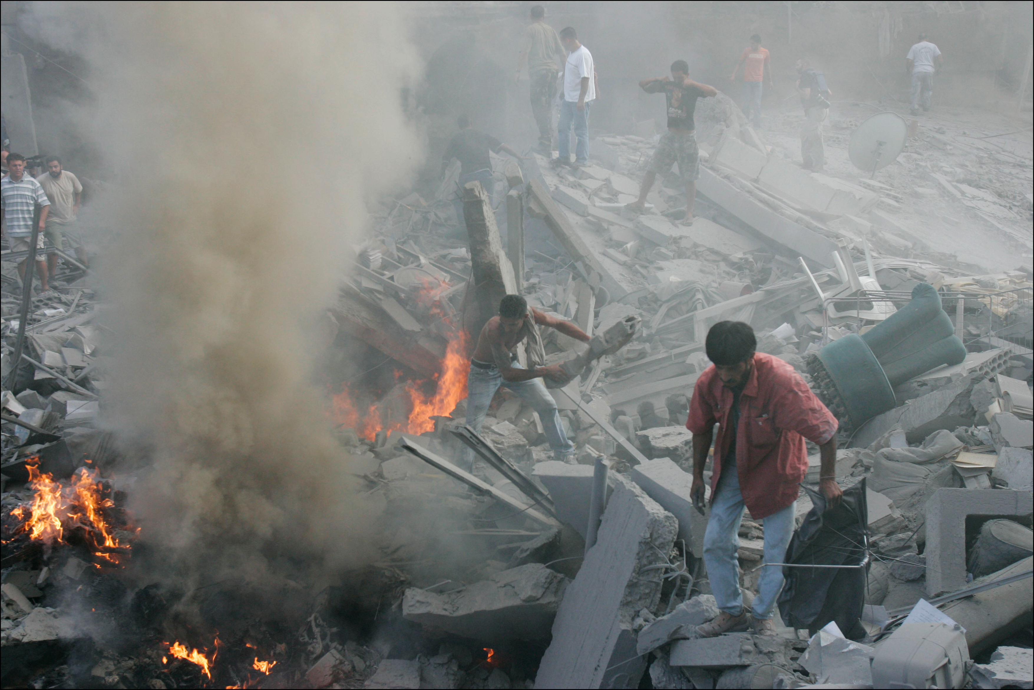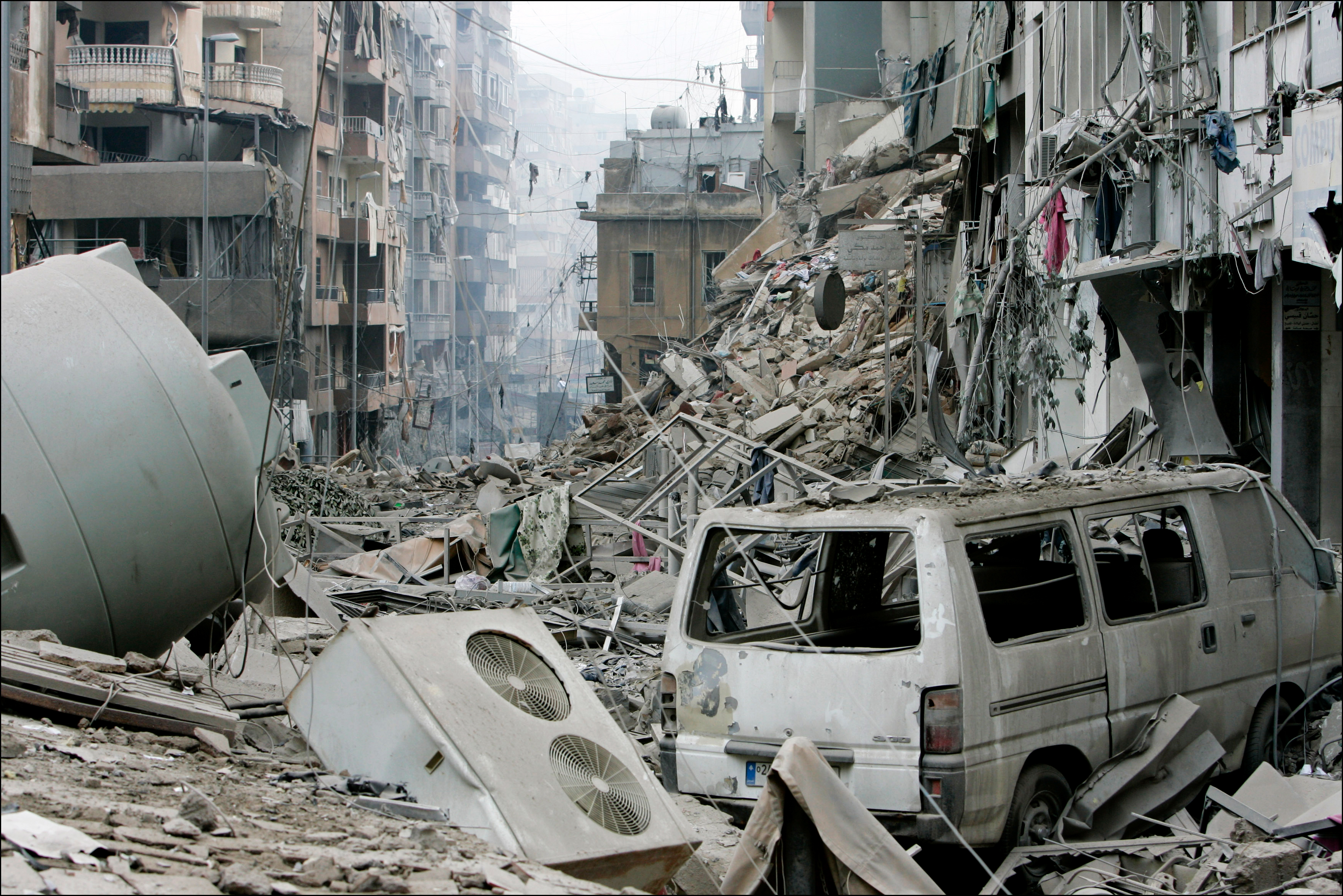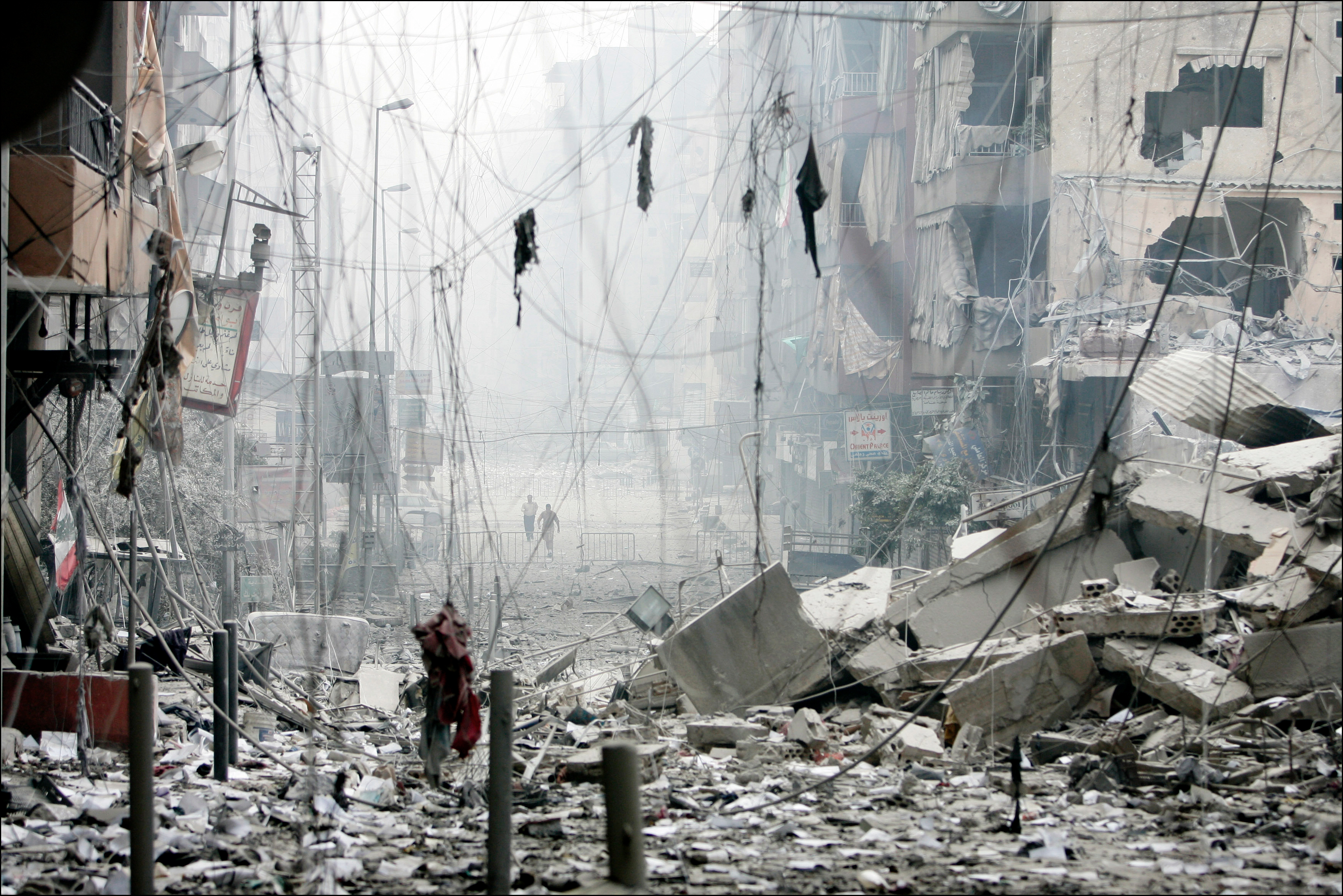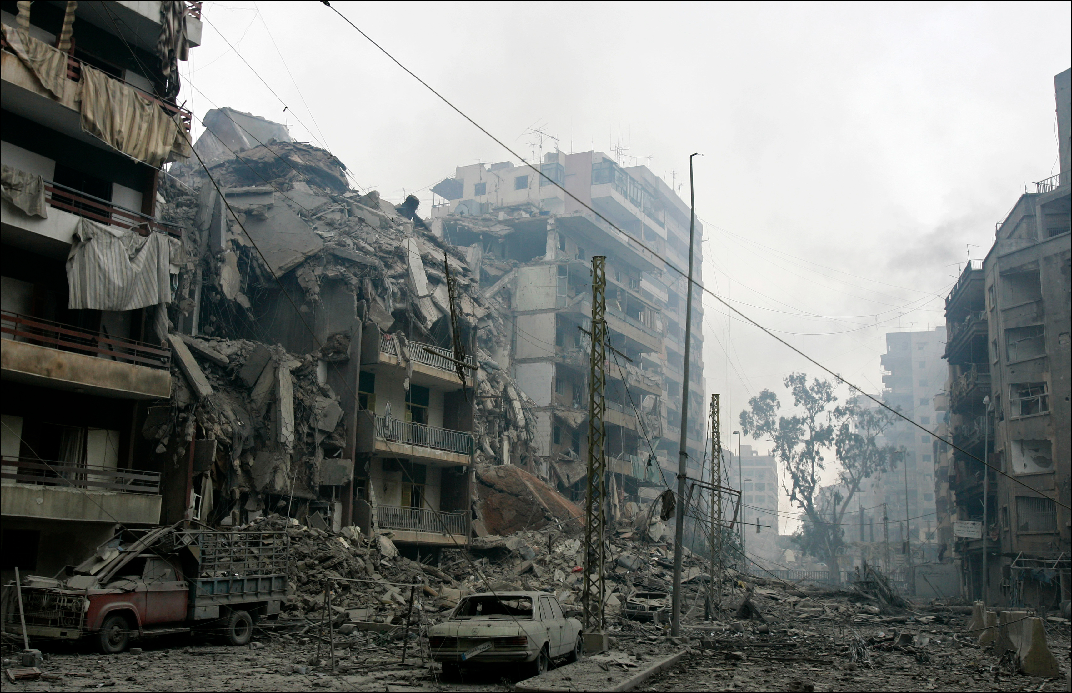 Daylight shows colossal damage after Israeli rockets rained down on Lebanon’s capital. Entire apartment buildings dissapeared after Israeli vacuum bombs hit Beirut’s Southern Shiite suburb of Dahiyeh incessantly for 3 straight days. The suburbs, where few survivors were found, were embedded in silence July 16, 2006. -