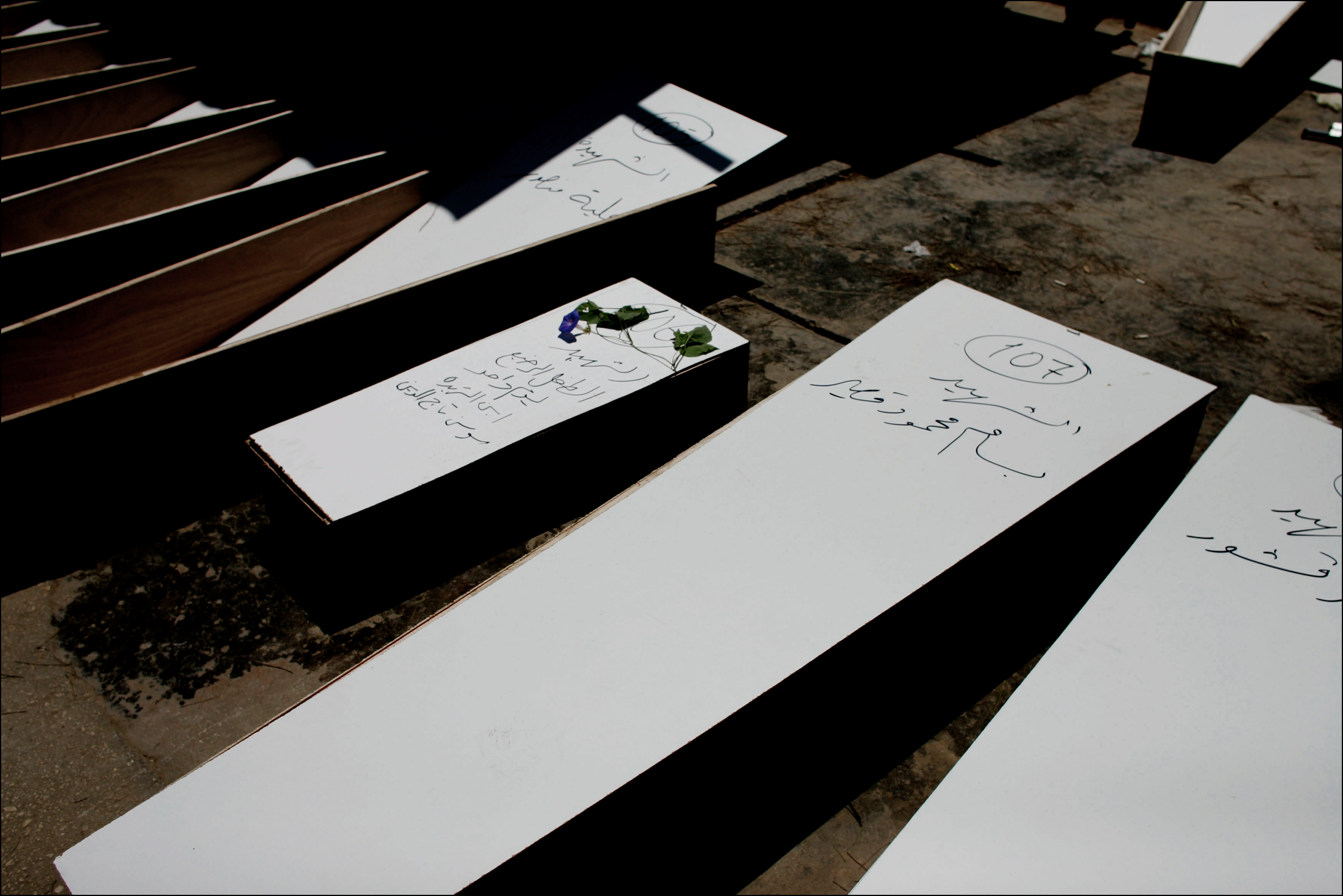 Decorated with a few flowers, the smallest of the 31 simple plywood coffins, center, made to contain one-day-old girl Sawsan Tajeldin, can be seen during the preparation for a mass burial of Lebanese victims at the southern port city of Tyre, Lebanon Saturday July 29, 2006. Tajeldin was killed along with her mother , when the car they were fleeing from the nearby village of Bazouriyeh was hit by an Israeli warplane missile strike. With a few mourners at hand, 31 victims of Israel’s two-week long bombardment were buried in a mass grave in this Lebanese city