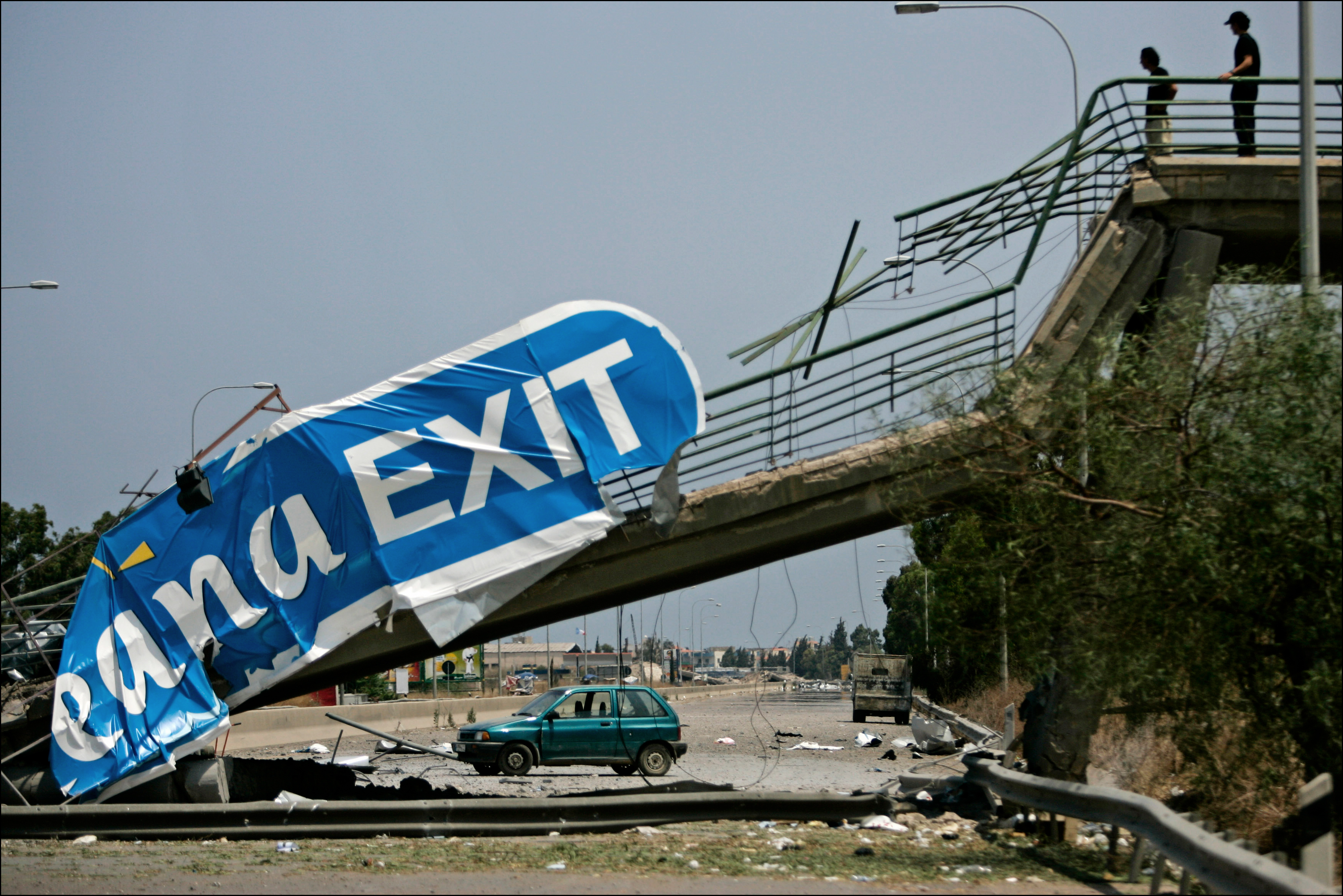 One of the collapsed bridges on Lebanon’s main North-South highway barrs passage, contributing to the paralysis of the country. The highway, along with many of the country’s bridges, major ports, power plants, and the international airport have been hit by Israeli aircraft and warships, which pounded areas in south, east and northern Lebanon on Saturday, a day after Hizbollah’s chief declared an open war against the Jewish state following the bombardment of his stronghold in Beirut.