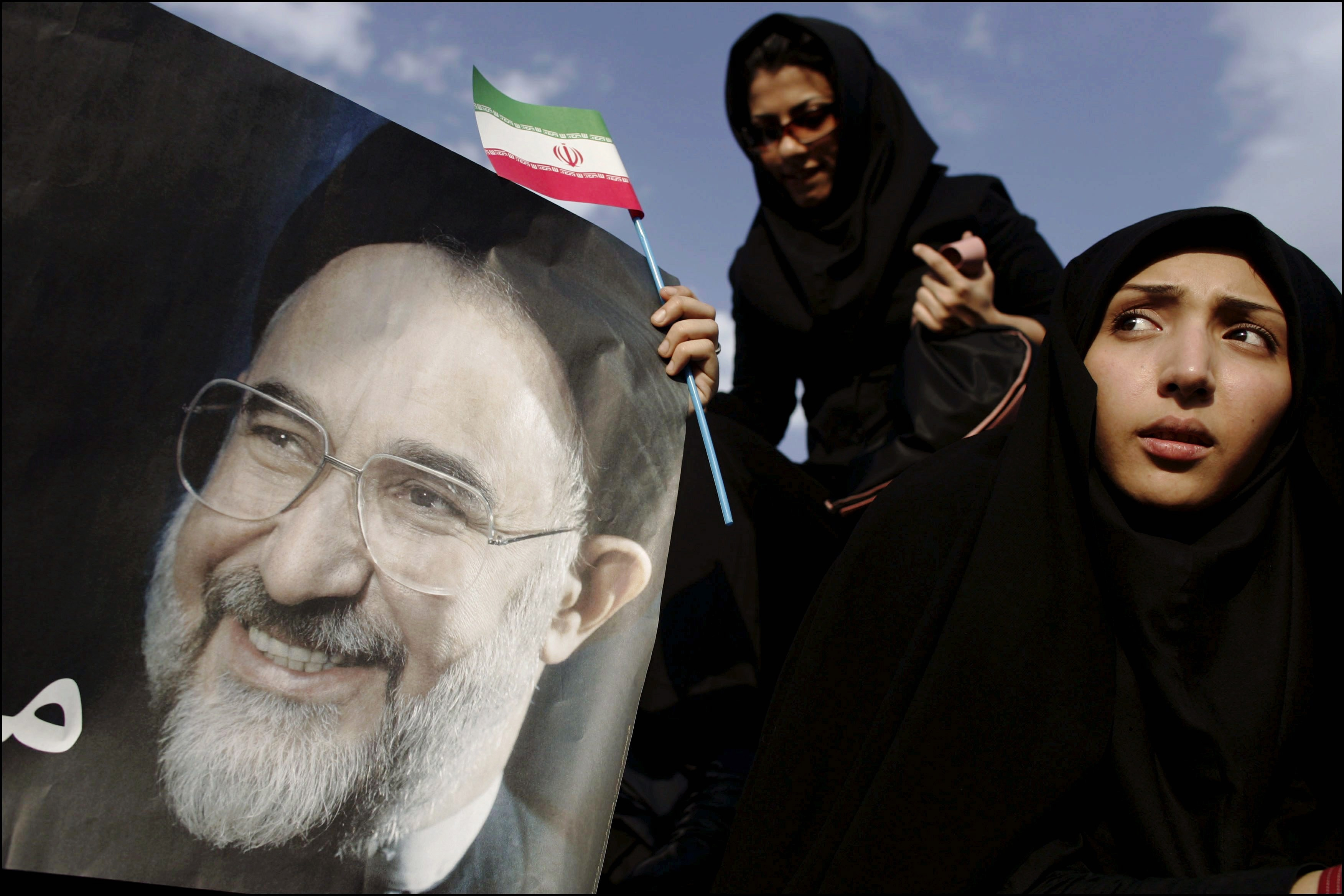 • Presidential candidate and outspoken Iranian reformist Mostafa Moin rally at the Tehran University stadium.   – On the poster President Khatami.