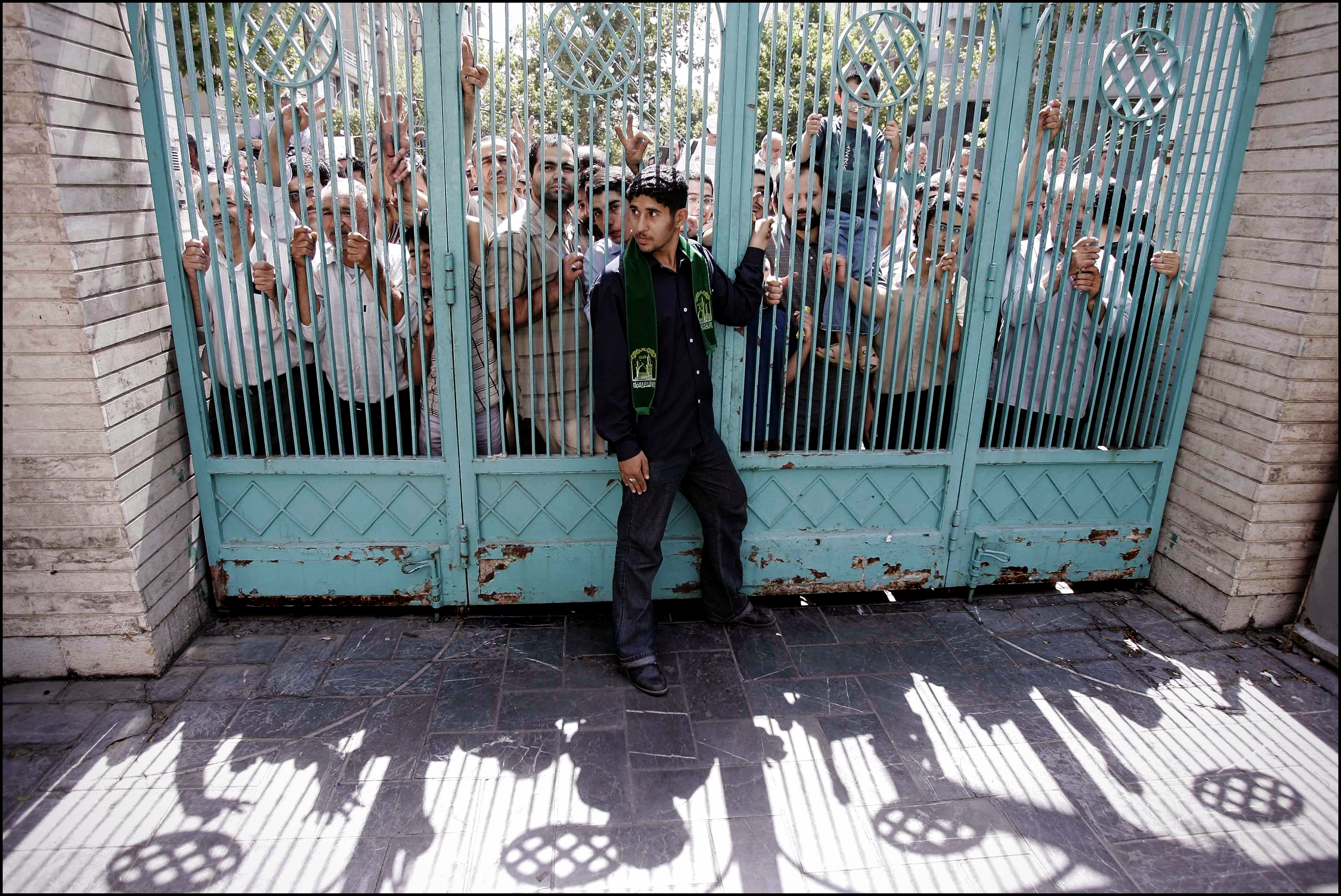 • At the polling station where Mahmoud Ahmadinejad, ultra conservative candidate is running for second round in the Iranian Presidential Election had cast his ballot, in East tehran. Here, Basiji guard at the gate. Photo by Frederic Lafargue/GAMMA